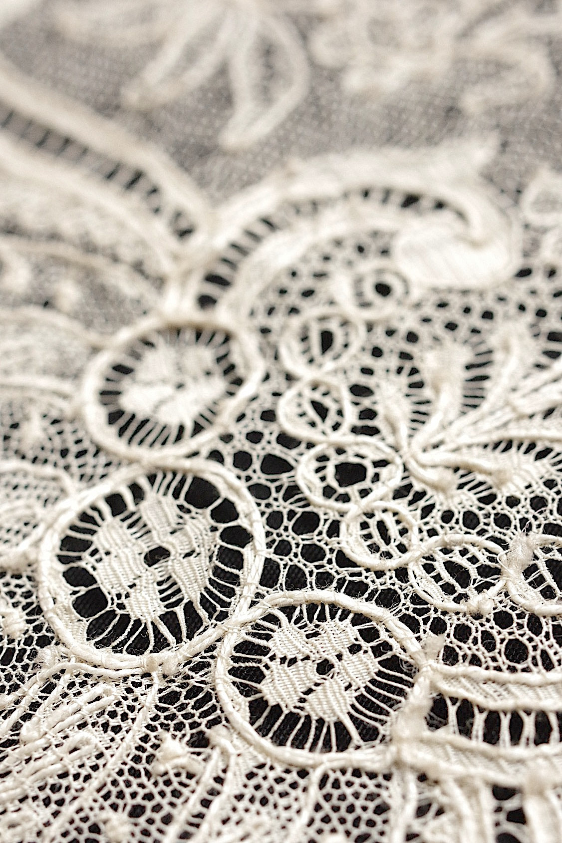 132cmと140cmの長さを持つこのアンティークレースは、繊細に仕上げられた古いマシンメイドの逸品です。時代を感じさせる美しいデザインが、あらゆる手作りやリメイクに上品なアクセントを添え、作品の価値を高めます。輪っか状になっています。素材に。