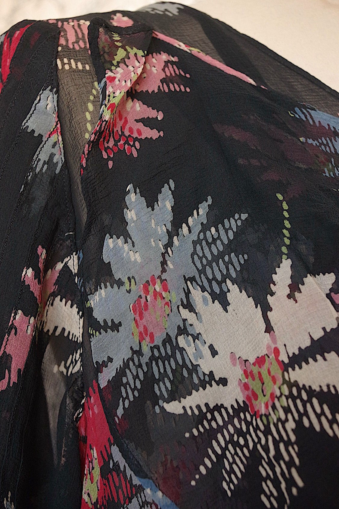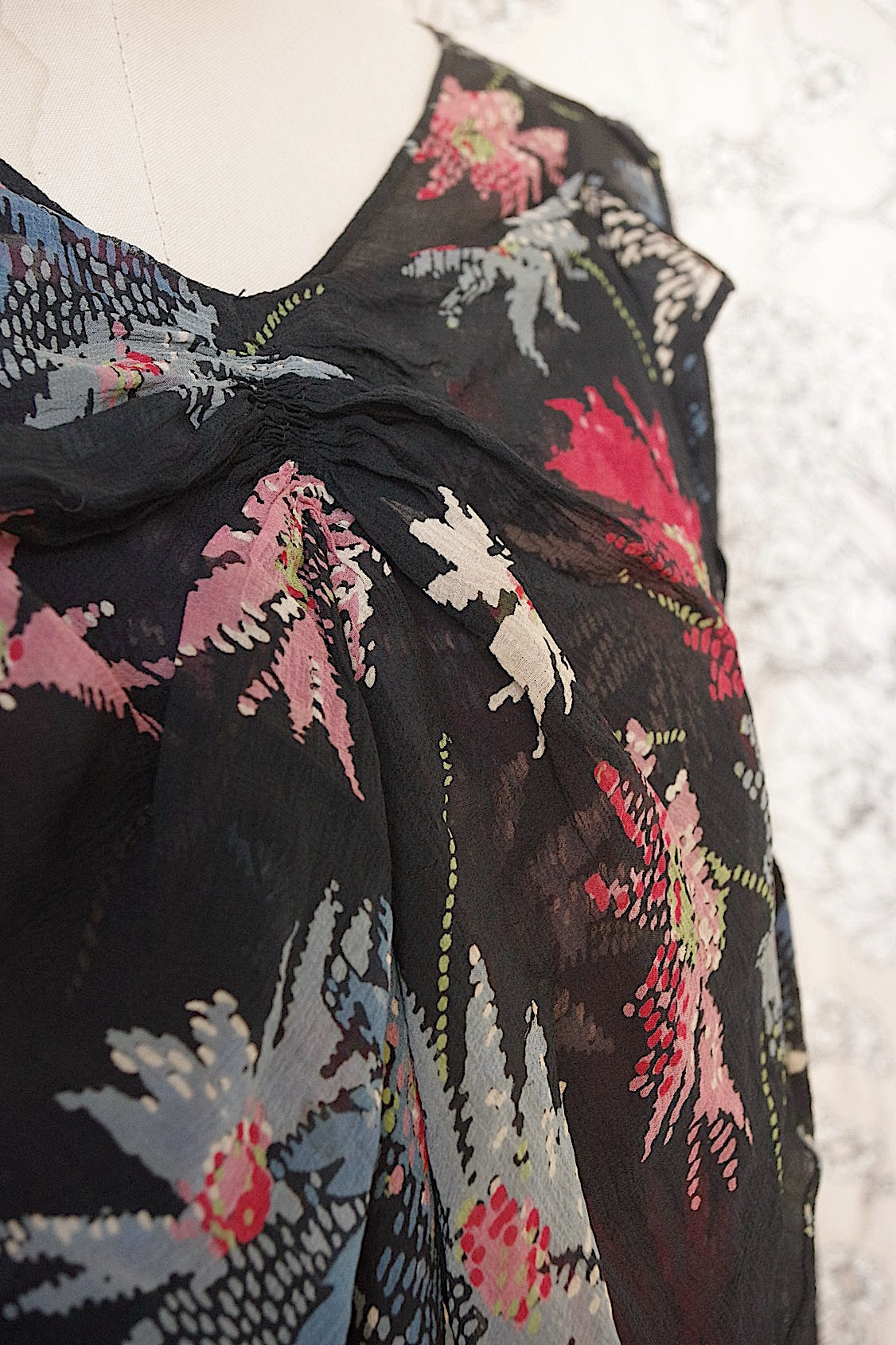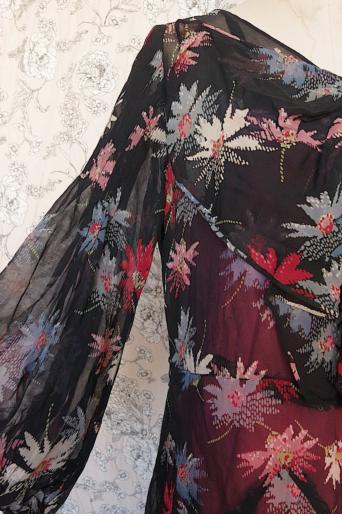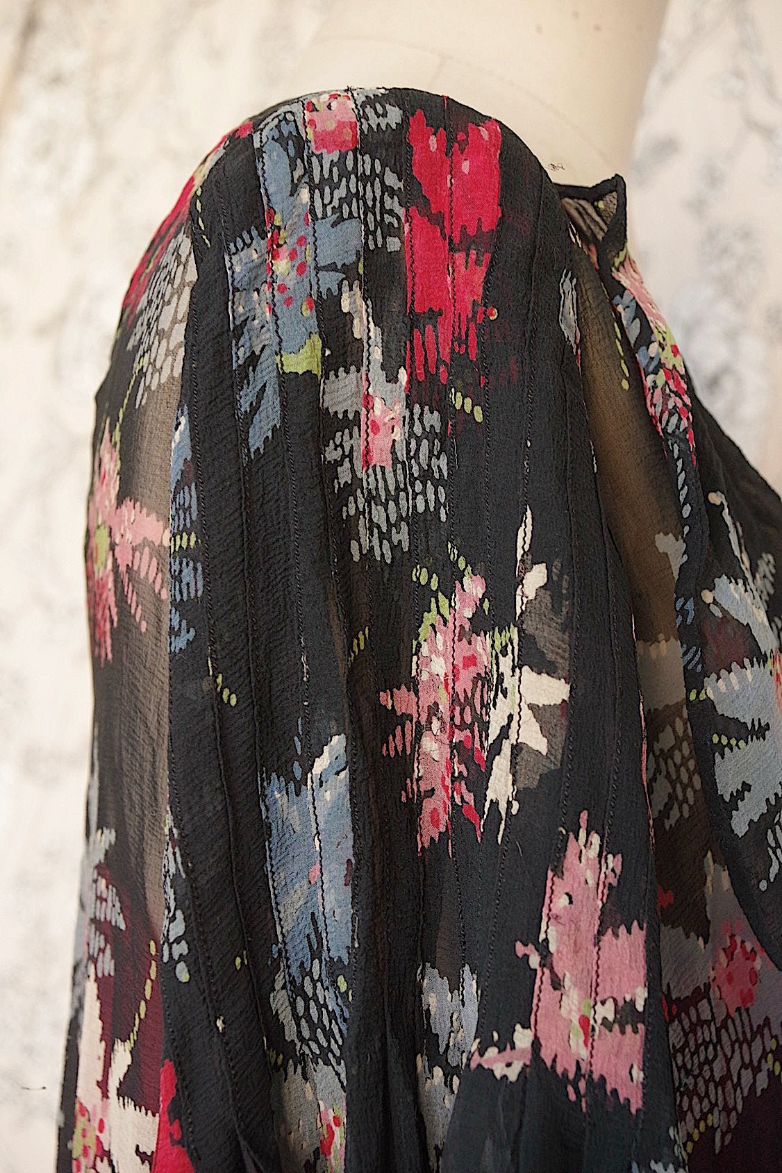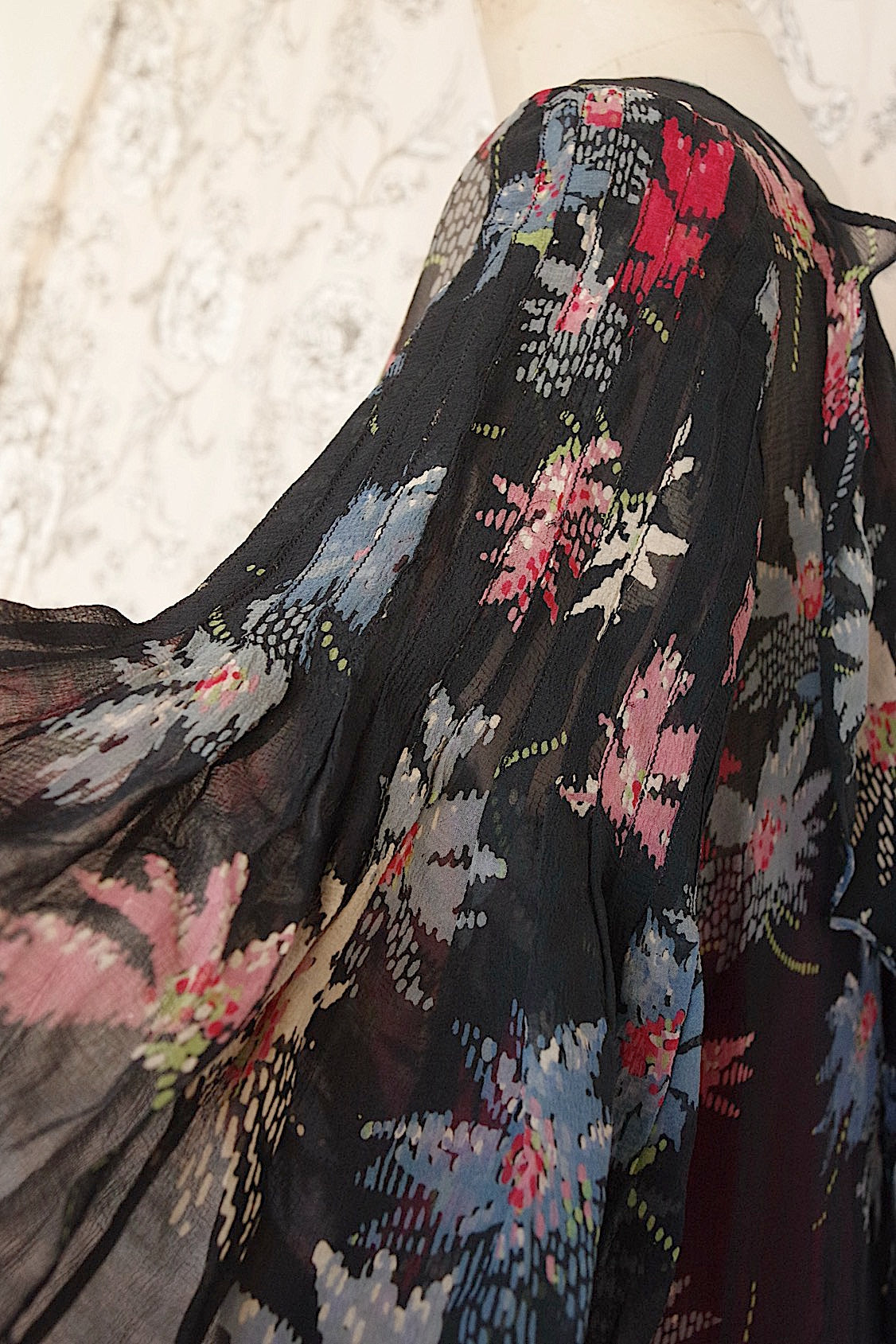 This antique silk chiffon dress boasts an intricate, sophisticated design that is rare today. The sleeves flare gracefully from tucks, creating a light, flowing movement. Delicate tucks around the waist create a three-dimensional effect and an elegant silhouette. This printed antique dress, which combines classic techniques and materials, is extremely rare and valuable, possessing a timeless beauty. It comes with a pink inner dress. The inner dress has been repaired.