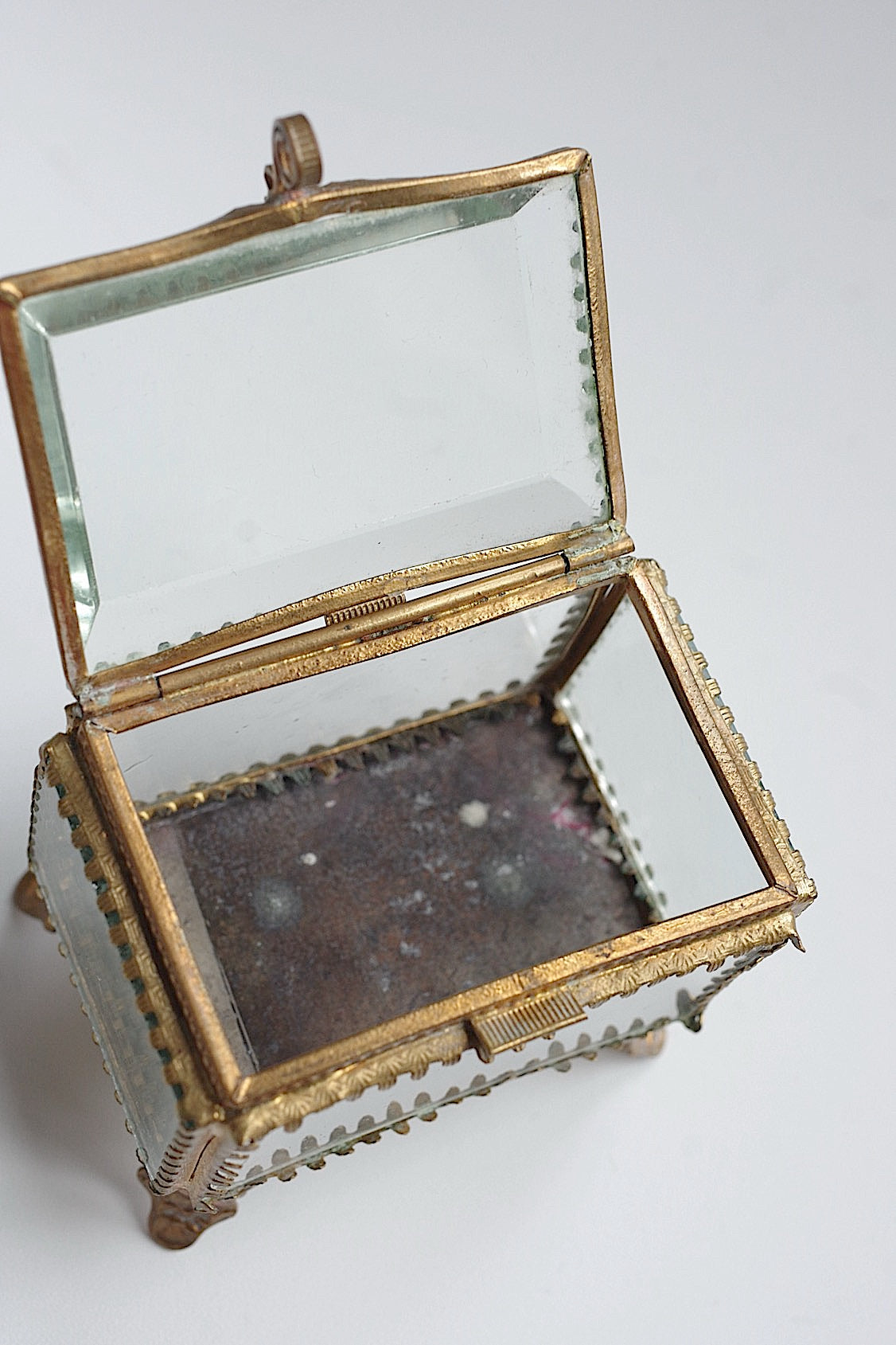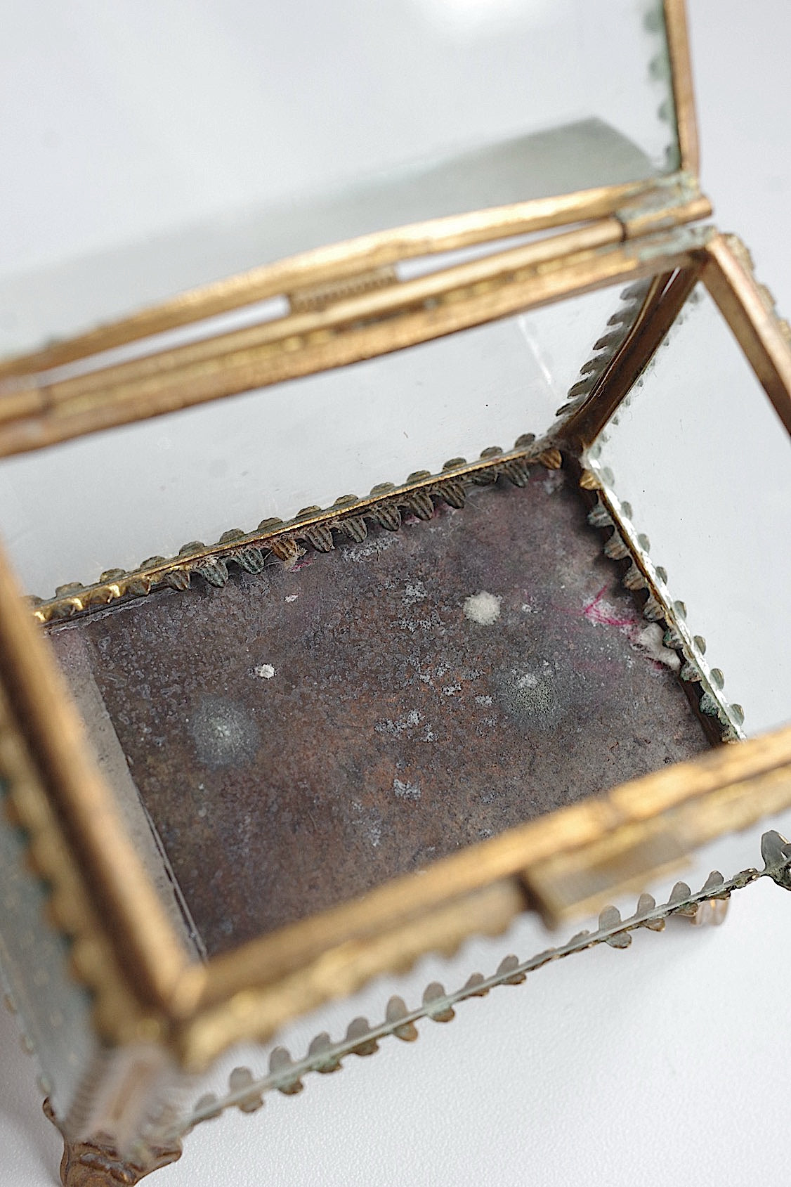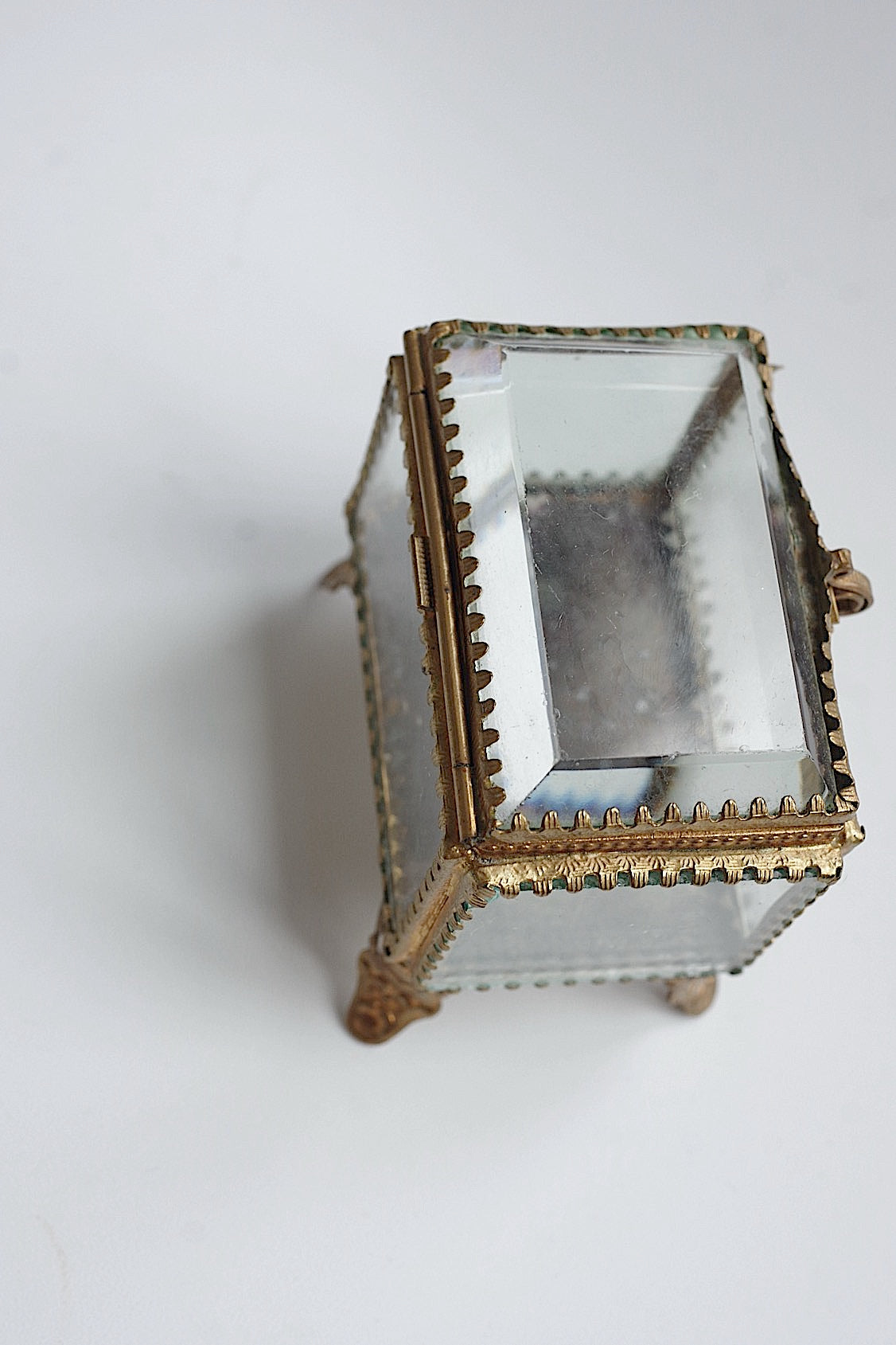 小さなアクセサリーを収納するのに最適なガラス箱です。置くだけで空間にアンティークならではの趣を演出し、大切なアクセサリーを上品に飾ります。クラシカルな美しさが日常に特別感をもたらす一品です。中のクッションが不足しています。お好みのアンティーク生地を敷いてみてくださいませ。