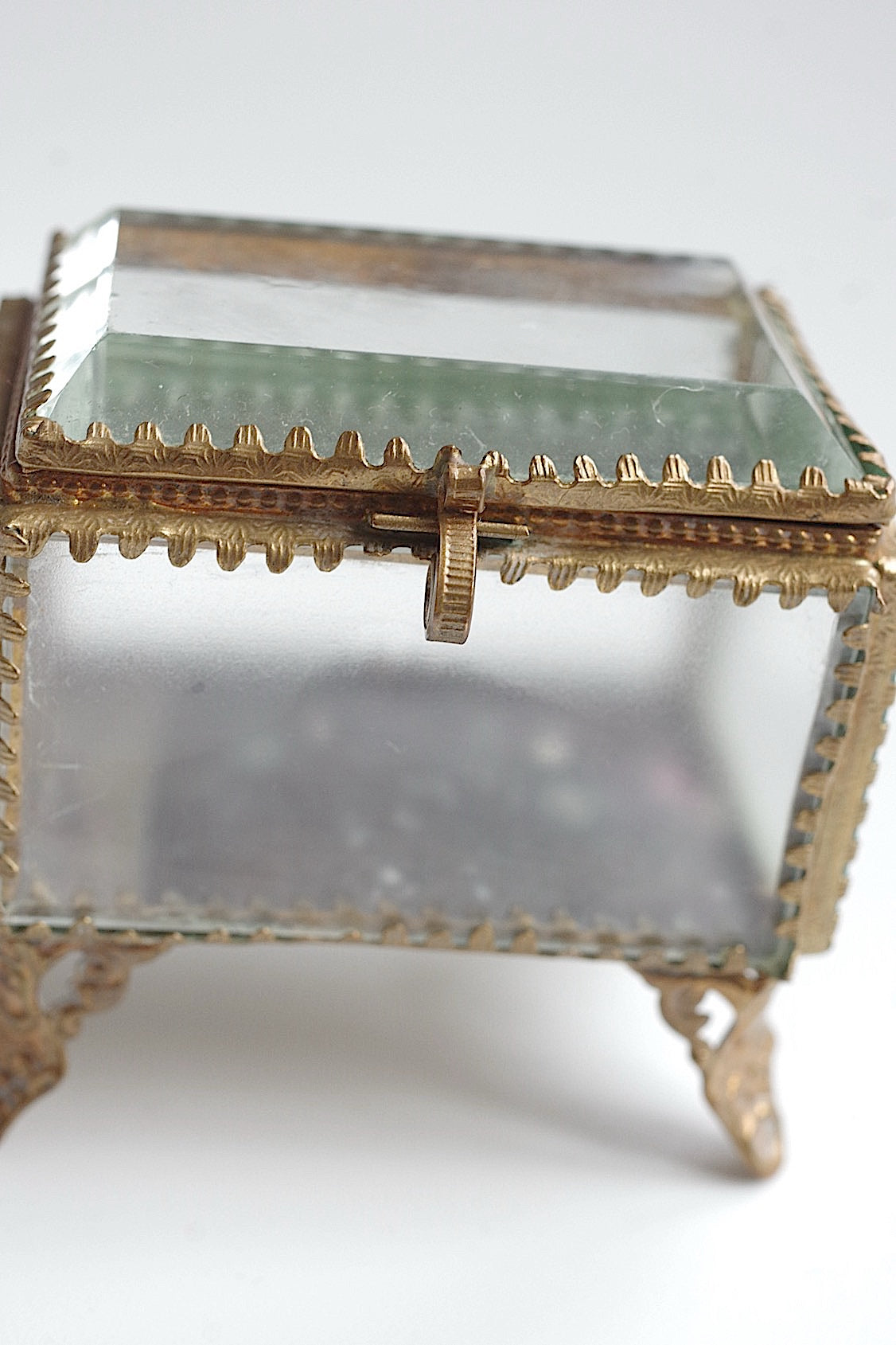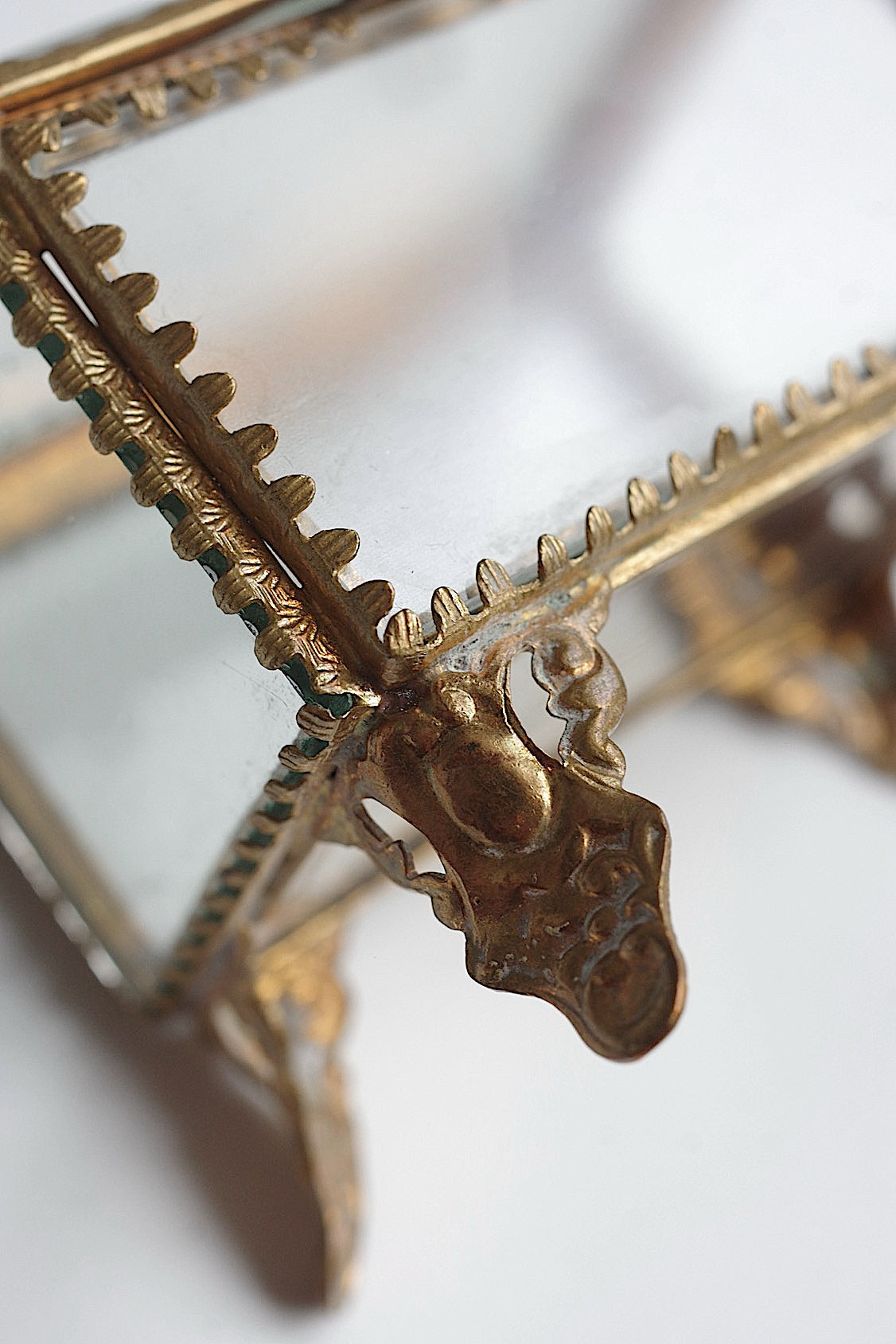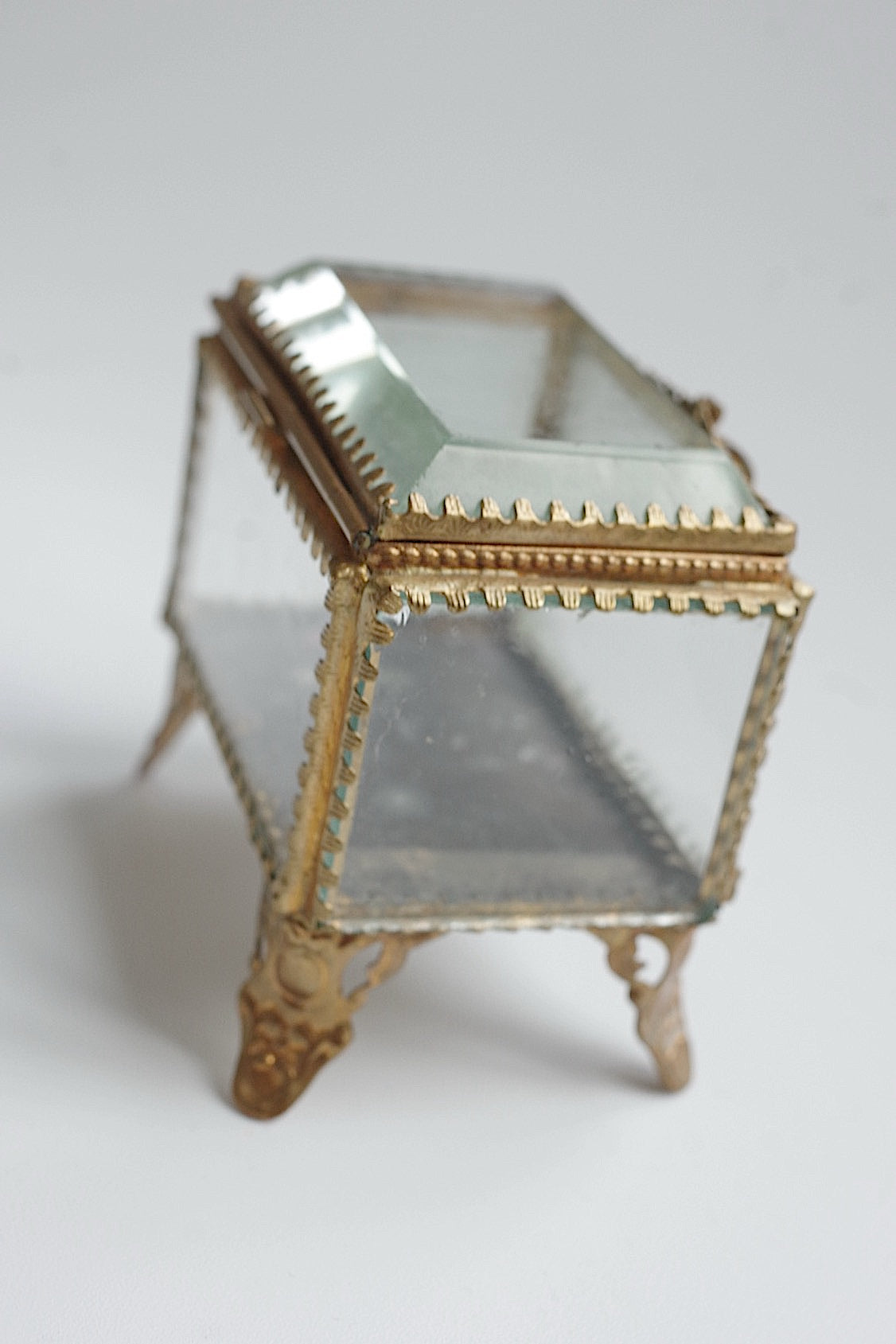 小さなアクセサリーを収納するのに最適なガラス箱です。置くだけで空間にアンティークならではの趣を演出し、大切なアクセサリーを上品に飾ります。クラシカルな美しさが日常に特別感をもたらす一品です。中のクッションが不足しています。お好みのアンティーク生地を敷いてみてくださいませ。