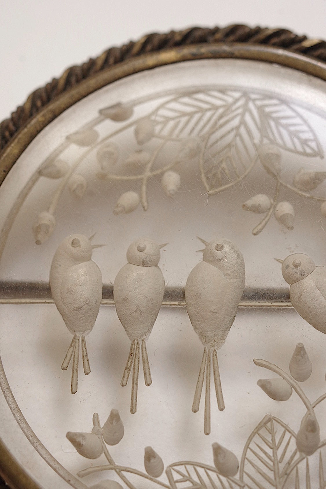 繊細なアクリル樹脂に裏彫りされた小鳥のデザインが立体的に浮かび上がり、奥行きと透明感を楽しめるアンティークブローチです。クラシックな魅力とモダンな技術が融合し、どんな装いにも可愛らしいアクセントを添えます。日常を特別に彩る一品としておすすめです。