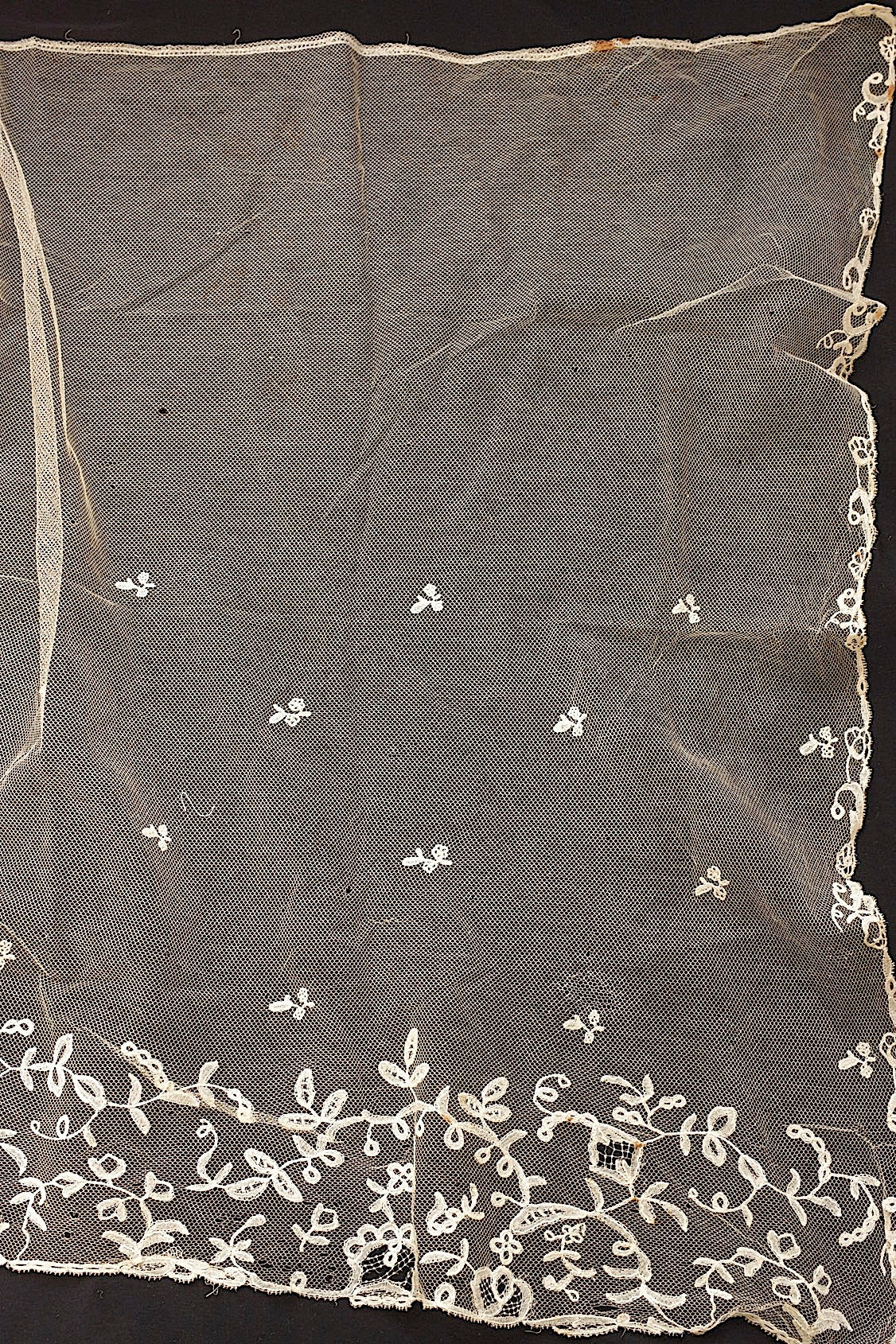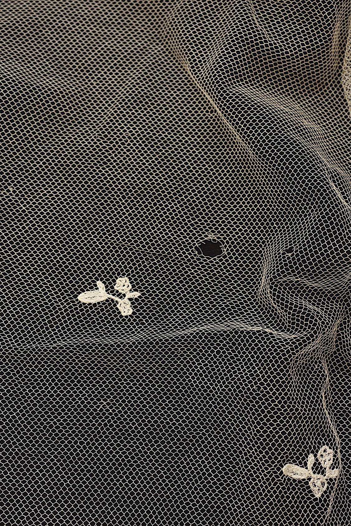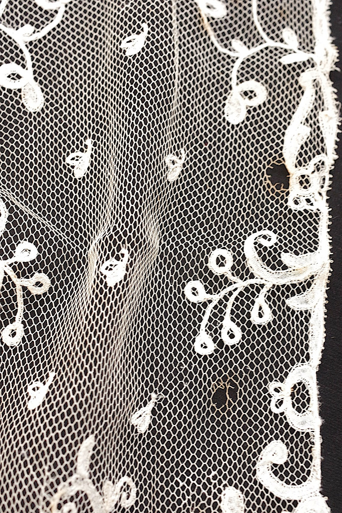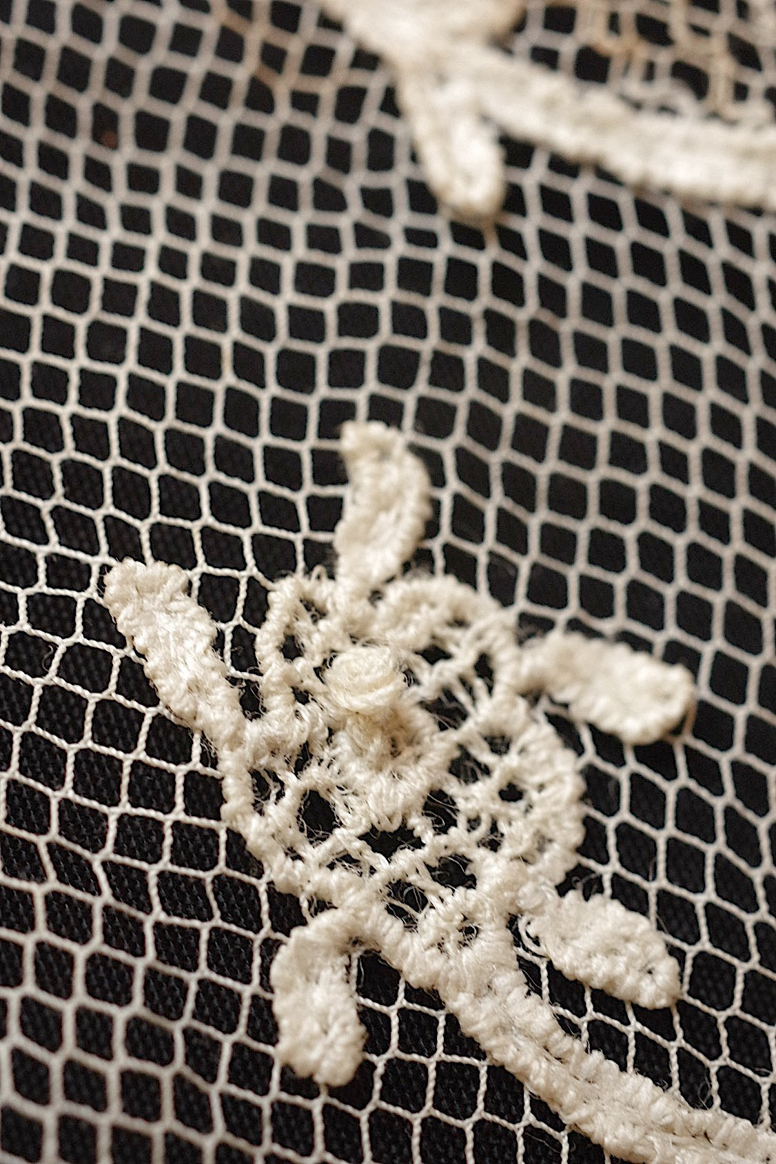 チュールに刺繍のレースと、アプリカッションモチーフレース2本と、今ではすっかり見かける事が少なくなったアプリケーションアングレテールレースです。極細糸のネット上にアプリカッションしてあります。繊細なレースなので、穴が数カ所見られます。それでも手に取ると納得のレースです。