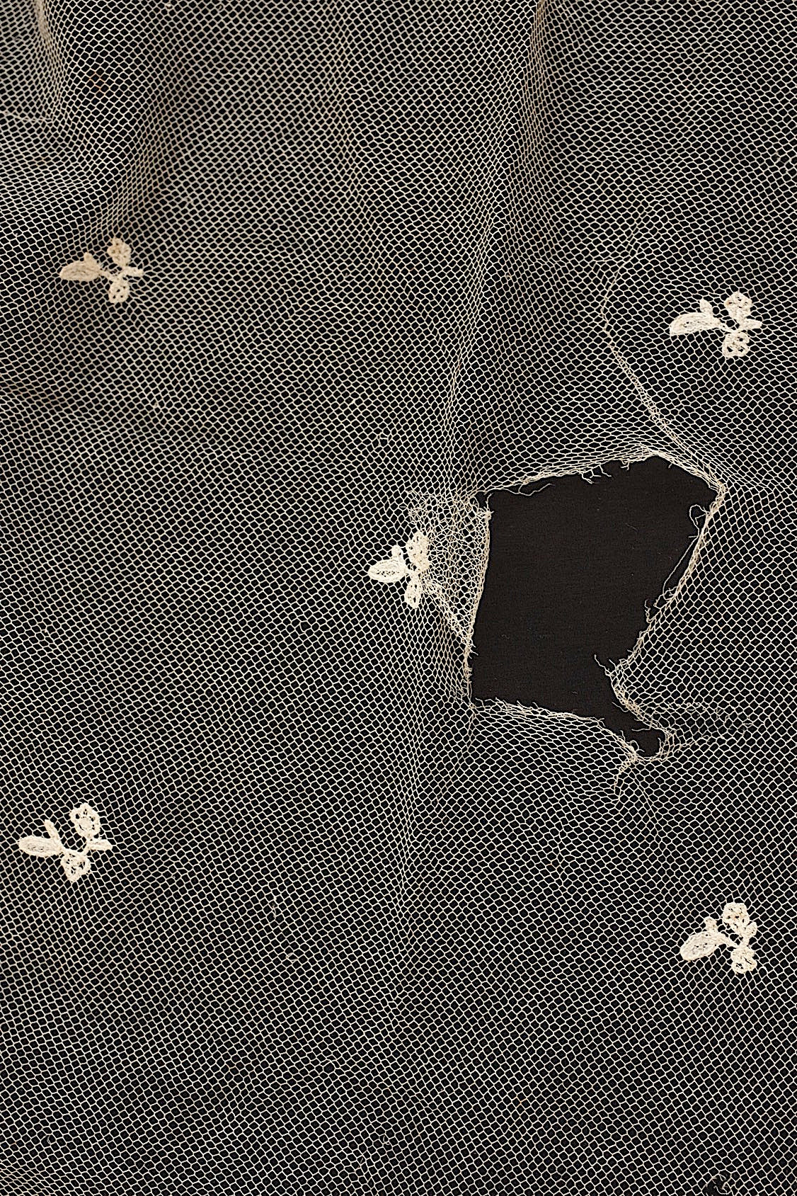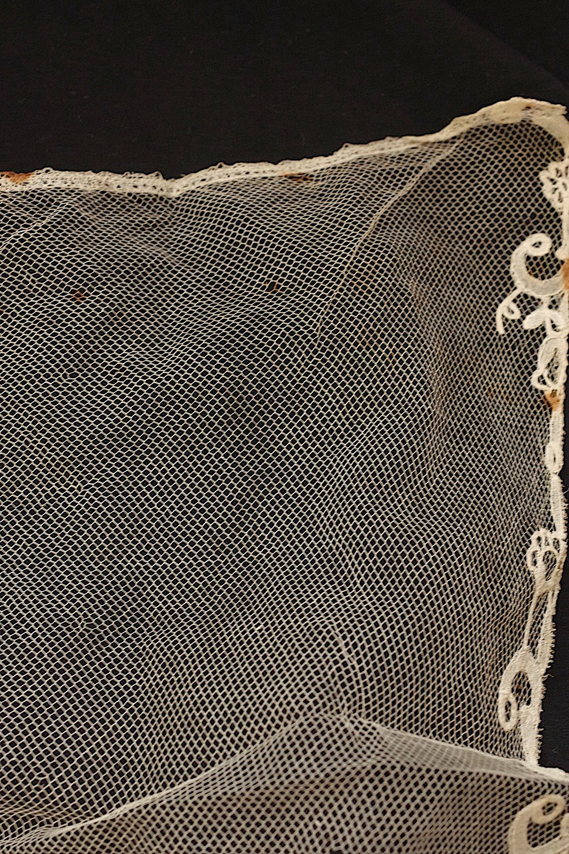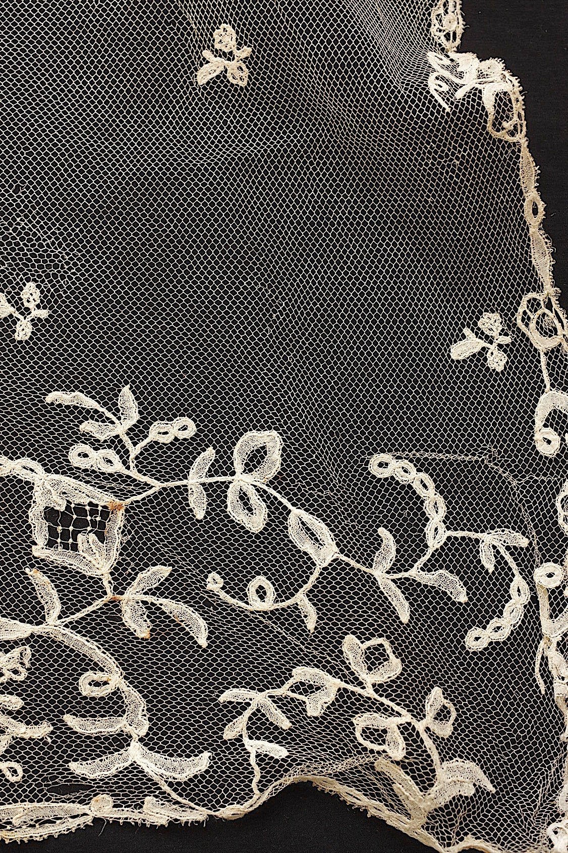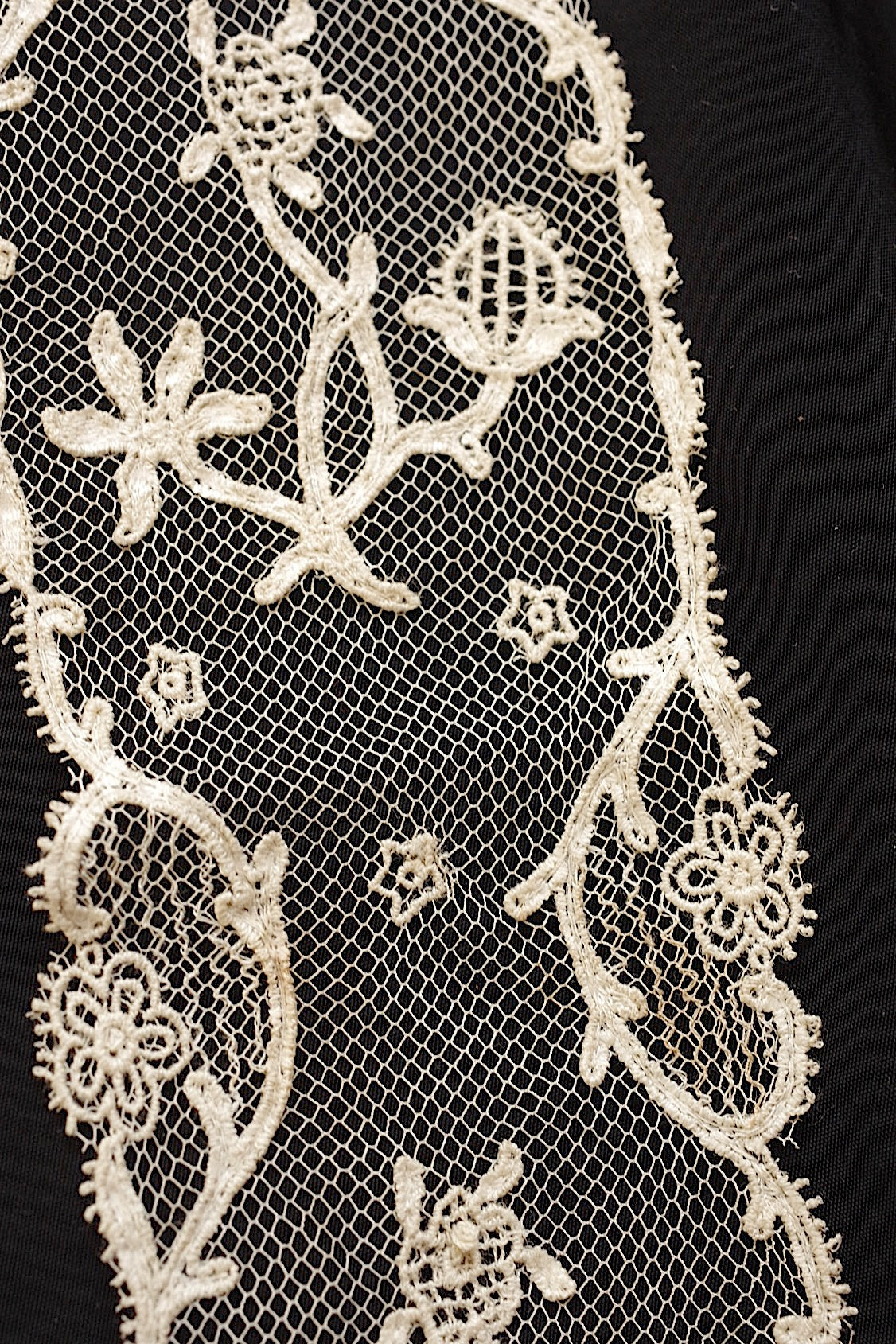 チュールに刺繍のレースと、アプリカッションモチーフレース2本と、今ではすっかり見かける事が少なくなったアプリケーションアングレテールレースです。極細糸のネット上にアプリカッションしてあります。繊細なレースなので、穴が数カ所見られます。それでも手に取ると納得のレースです。