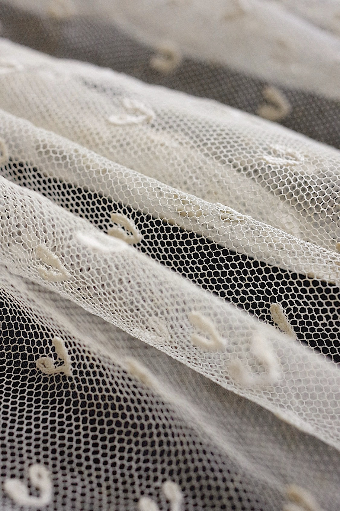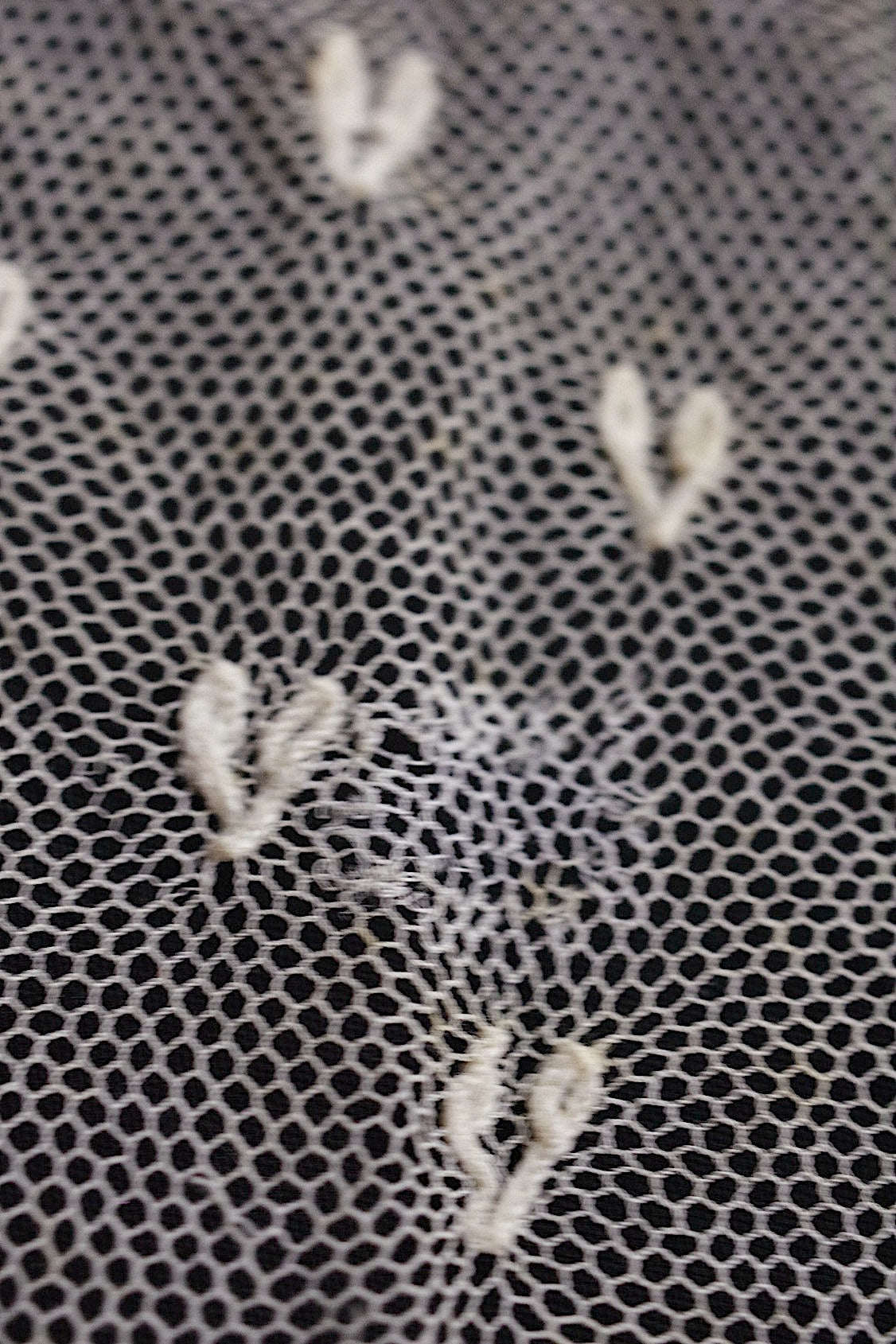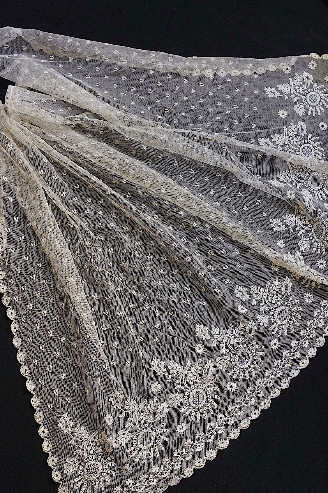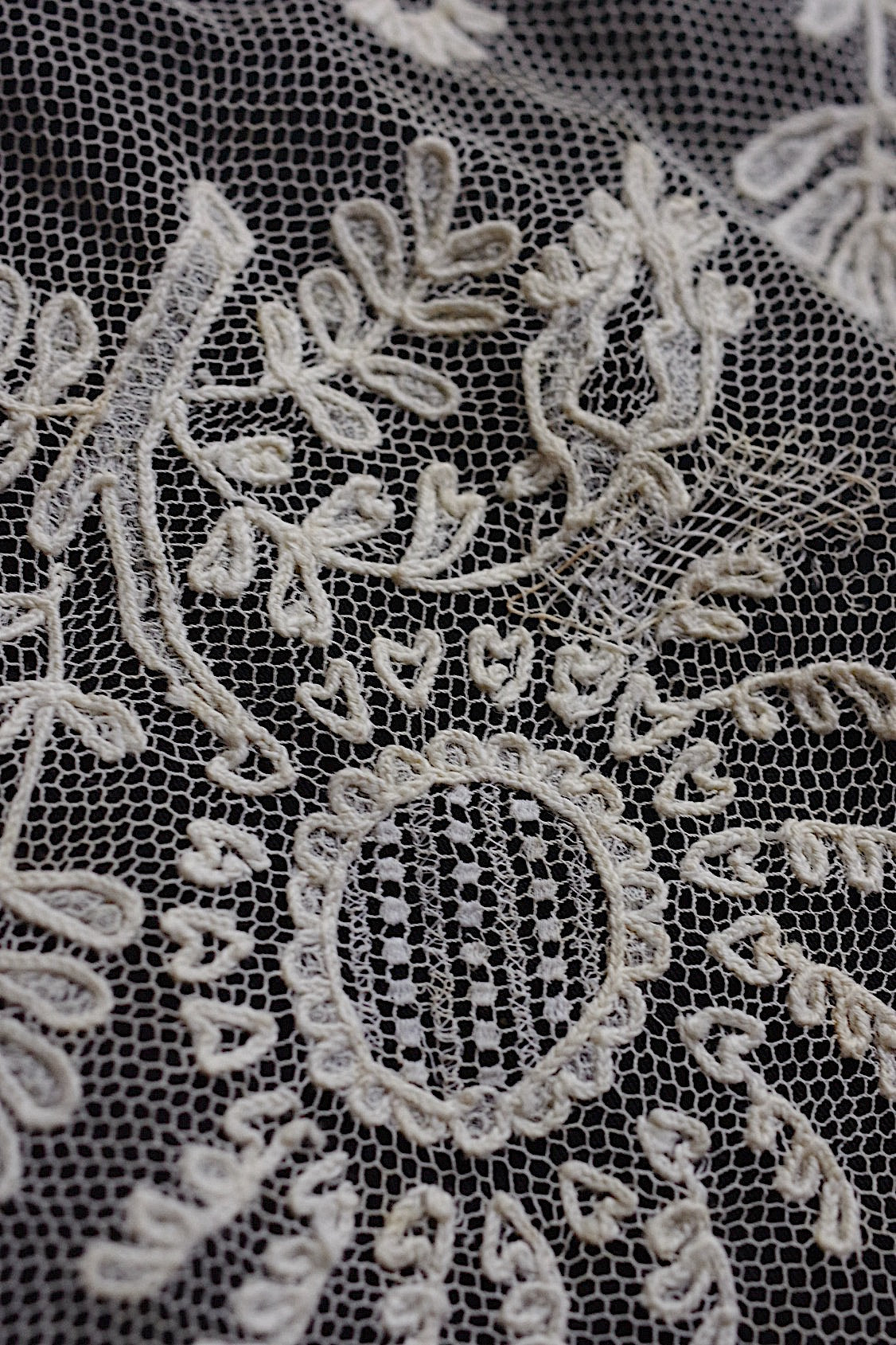 華麗なアンティークレースの刺繍が施された、贅沢なベールレース。小さなチェーンステッチが繊細な美しさを演出し、お部屋のインテリアとしても活躍するサイズ。エレガントで上質な雰囲気を漂わせる、アンティークレースのベール。補修、汚れが少し見られます。