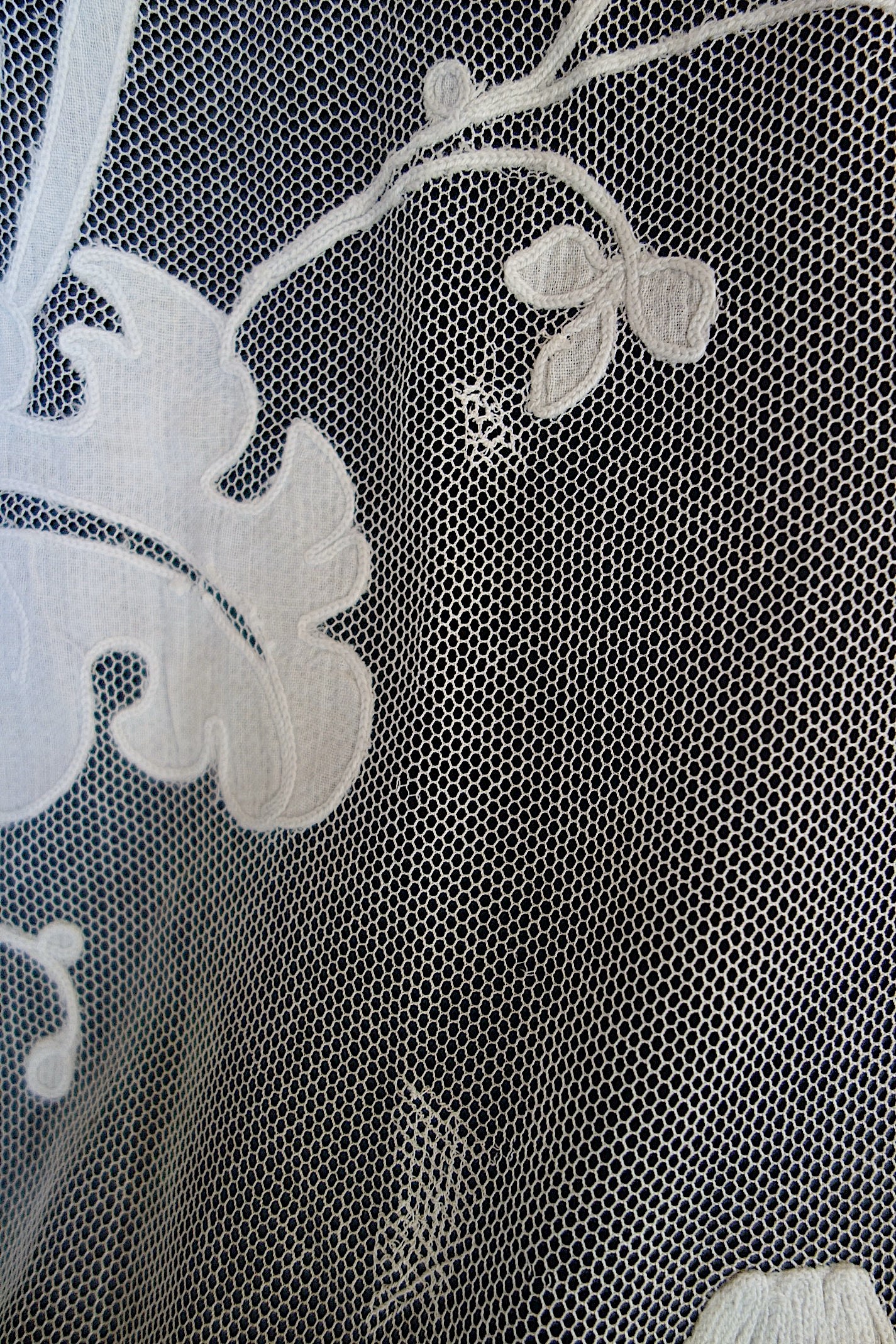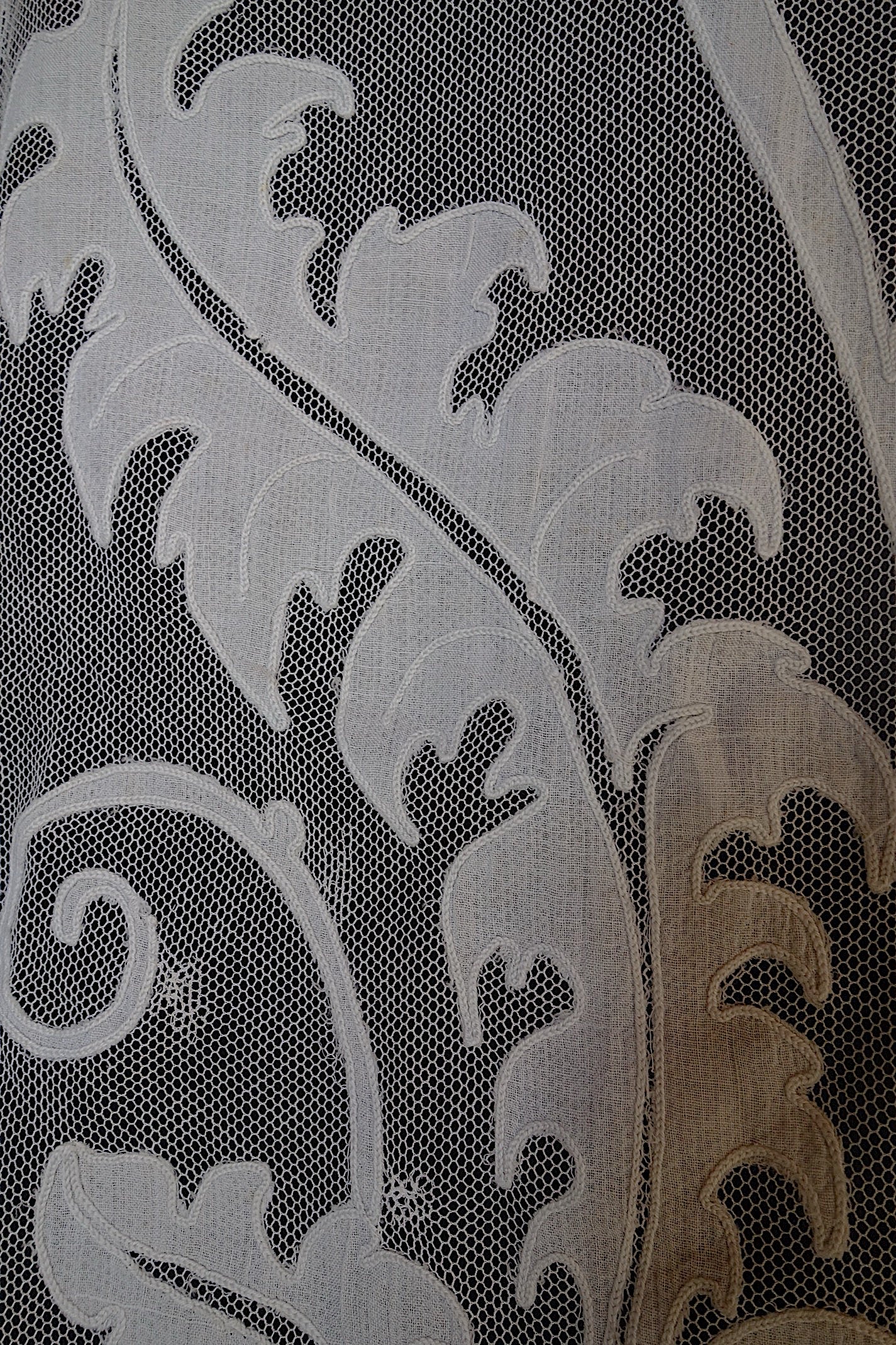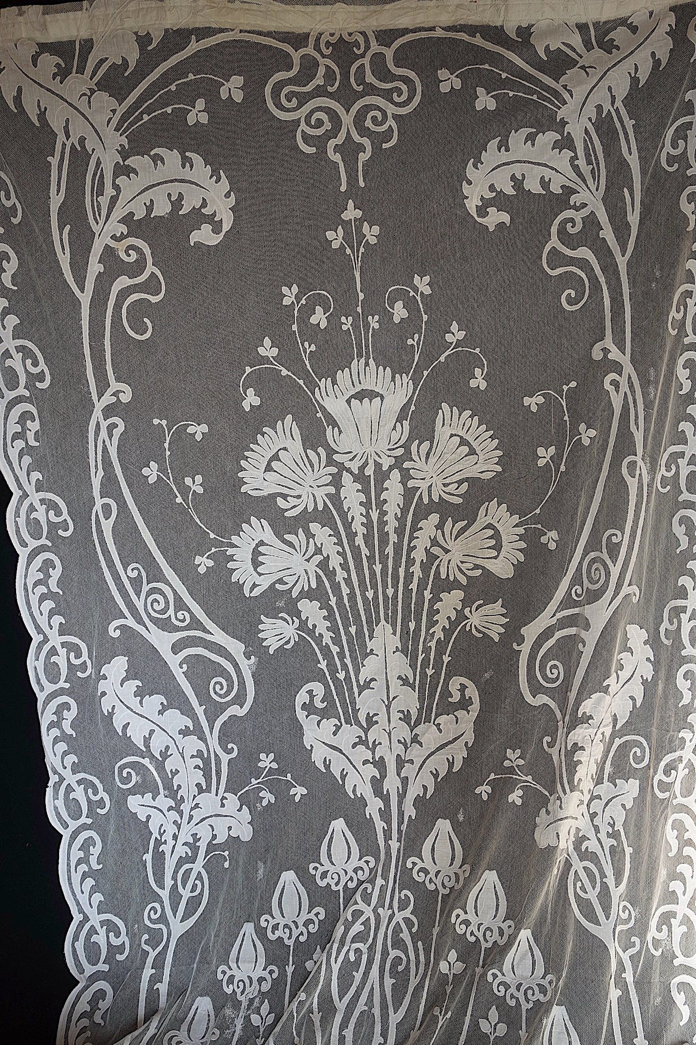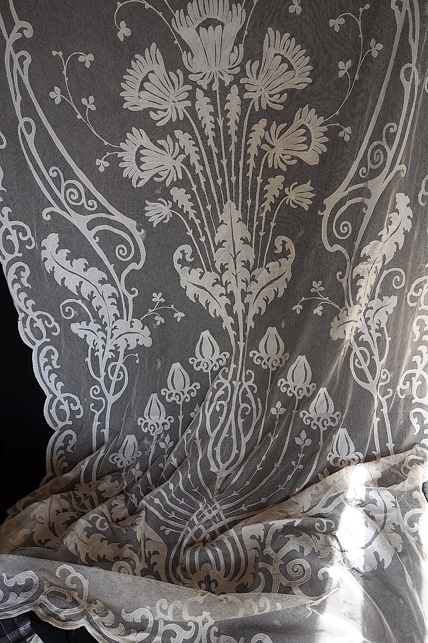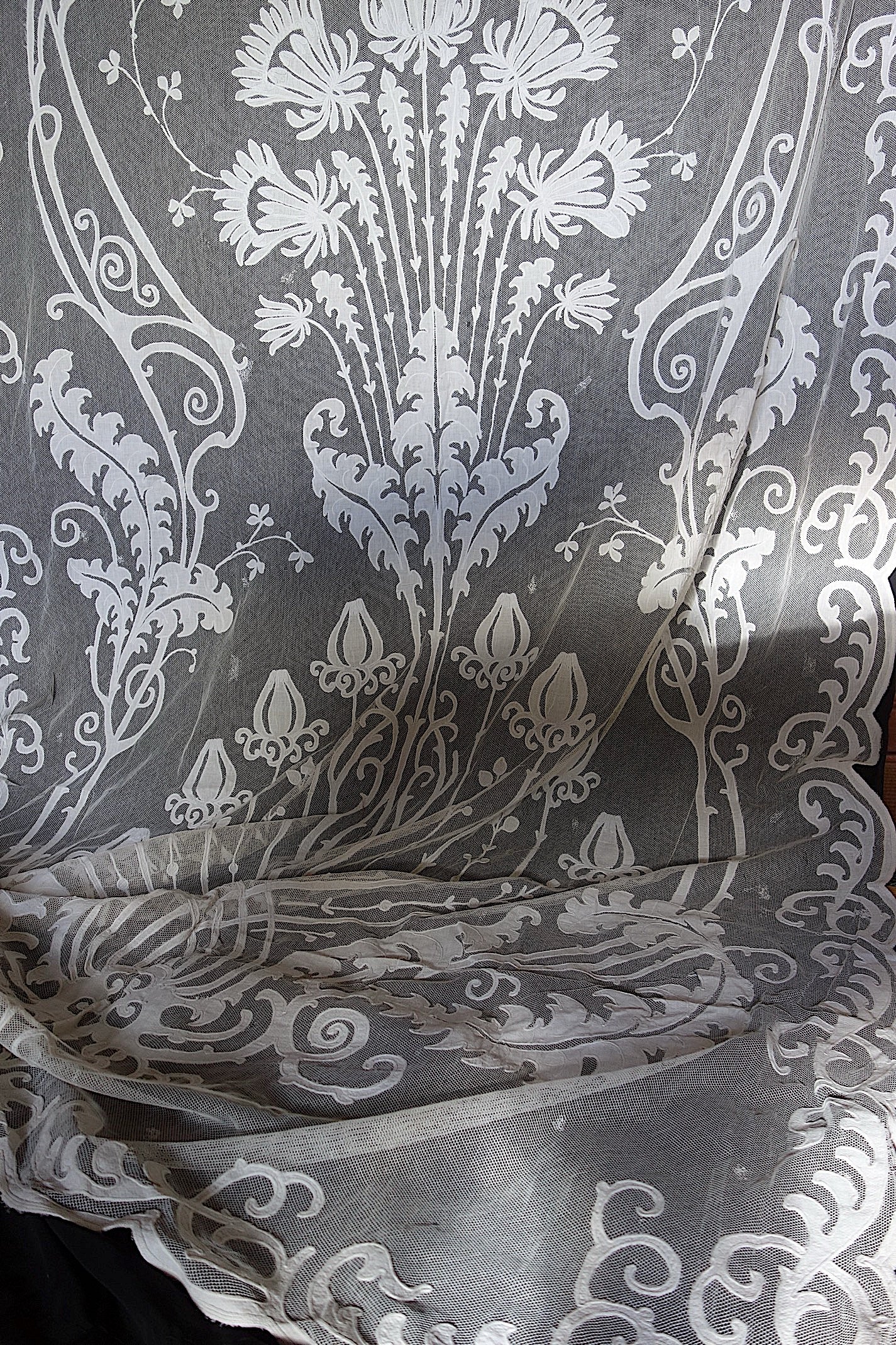 メッシュ地に描かれた優雅な花の曲線が、空間に洗練された表情をもたらすアンティークカーテン。透光性に優れたメッシュ素材が柔らかな光を通しながら、大振りな花モチーフが壁面に影を落とし、昼夜で異なる表情を演出します。モダンなインテリアにも調和する上質な一枚。窓辺に歴史と美しさを纏わせる、こだわりの逸品です。上辺には使いやすいようにカーテンフックが付いています。メッシュに補修が多々入っています。