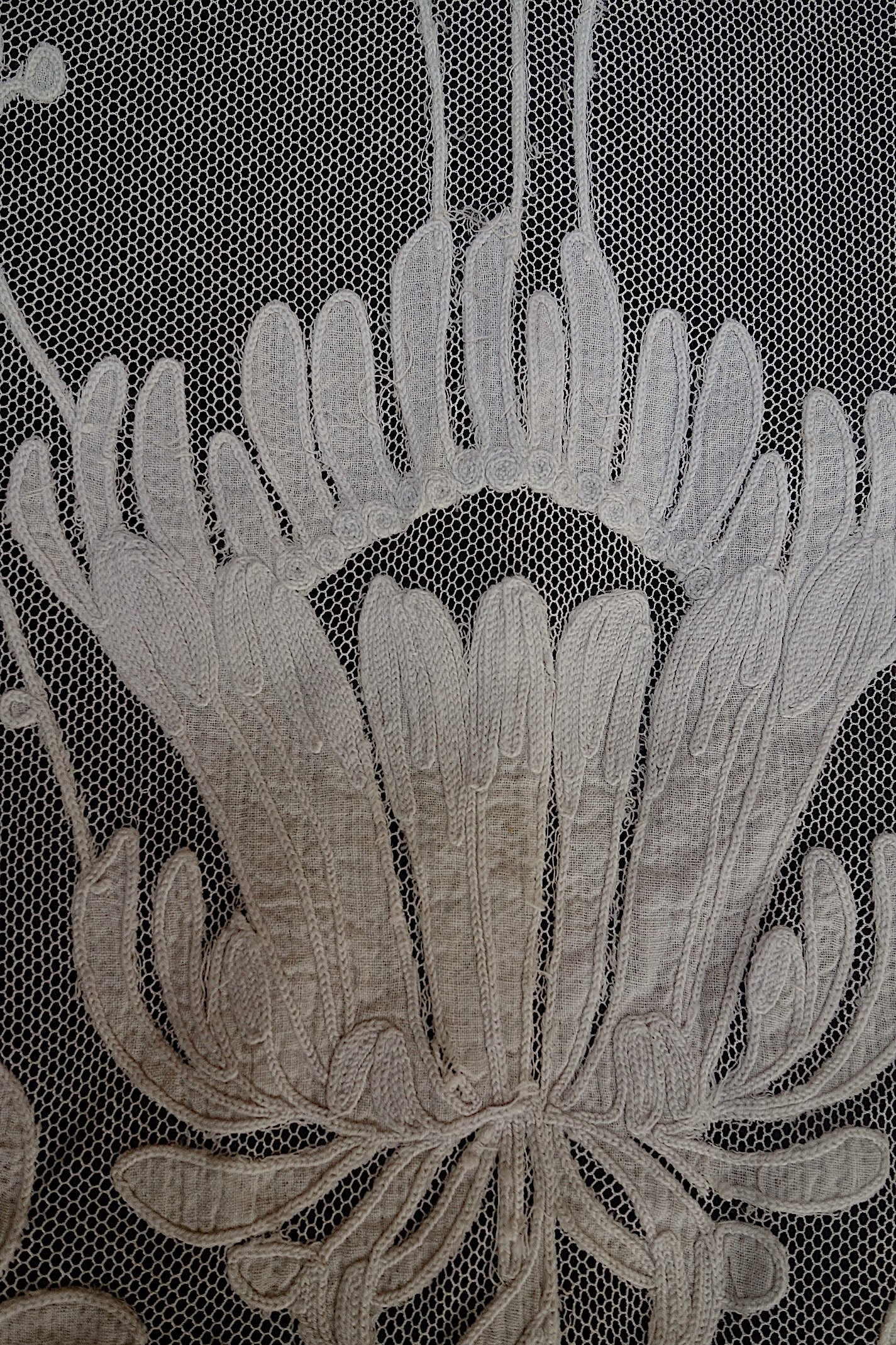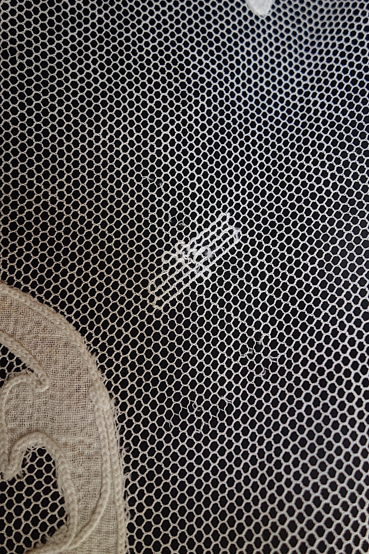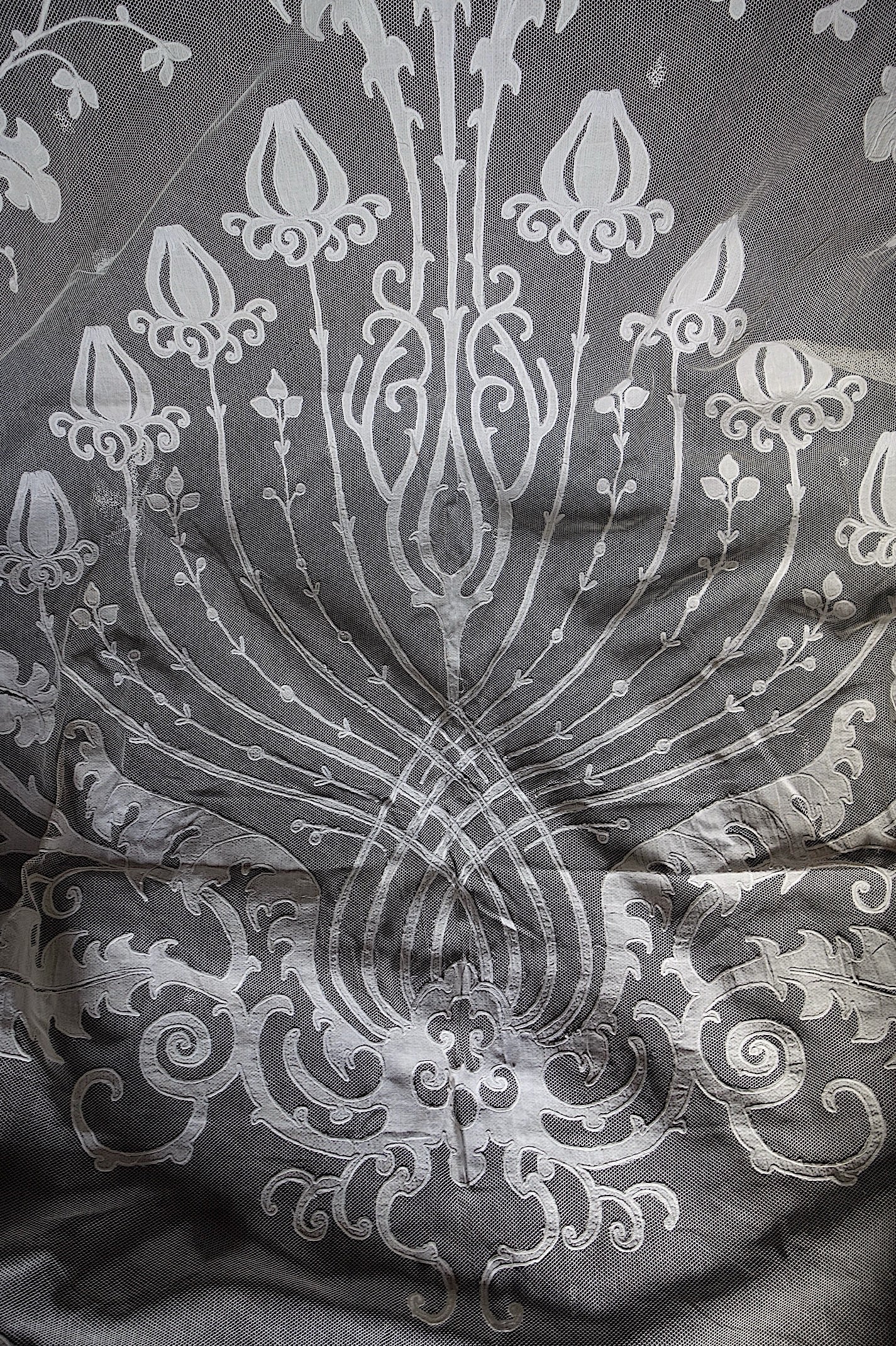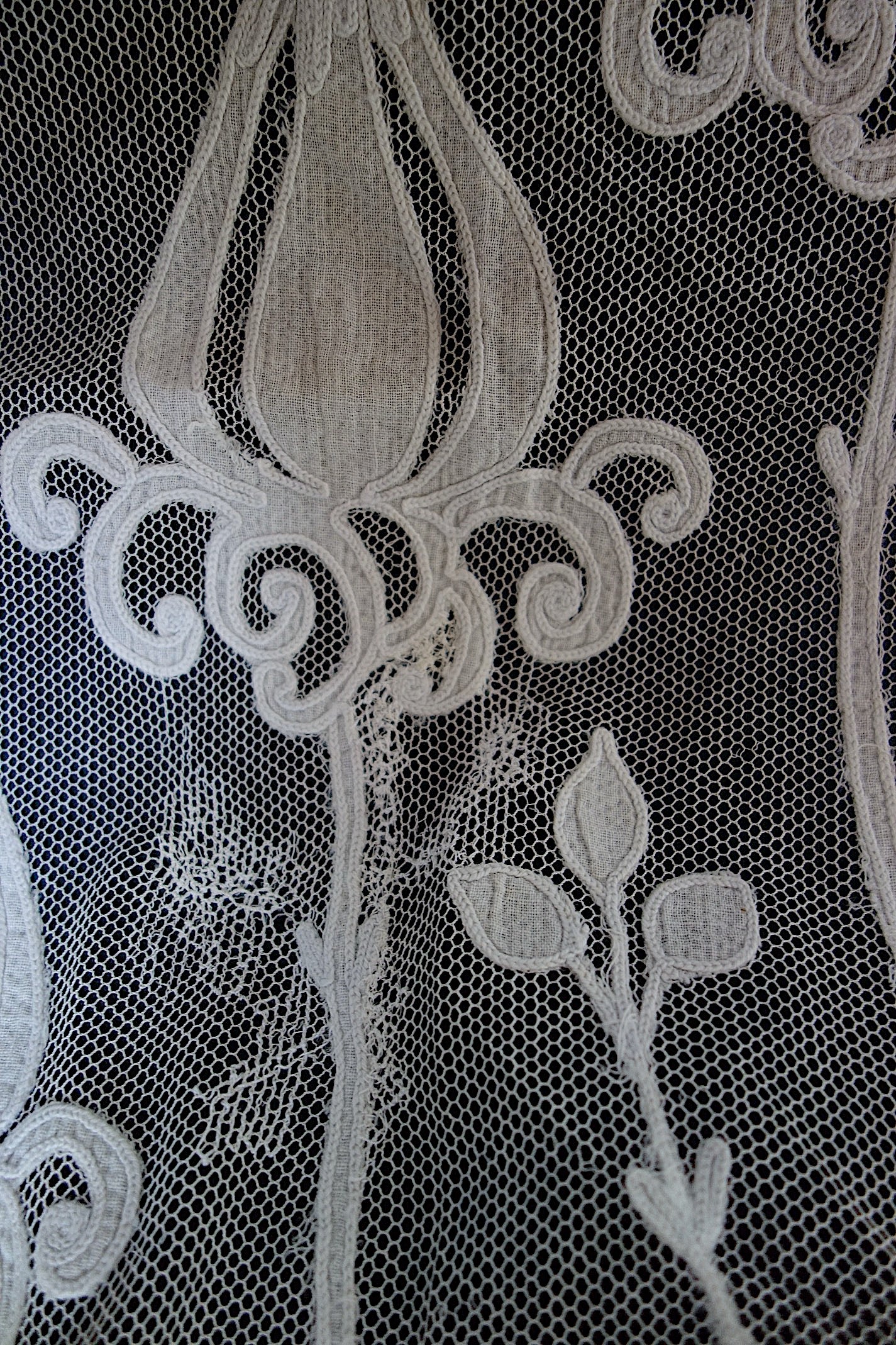 メッシュ地に描かれた優雅な花の曲線が、空間に洗練された表情をもたらすアンティークカーテン。透光性に優れたメッシュ素材が柔らかな光を通しながら、大振りな花モチーフが壁面に影を落とし、昼夜で異なる表情を演出します。モダンなインテリアにも調和する上質な一枚。窓辺に歴史と美しさを纏わせる、こだわりの逸品です。上辺には使いやすいようにカーテンフックが付いています。メッシュに補修が多々入っています。