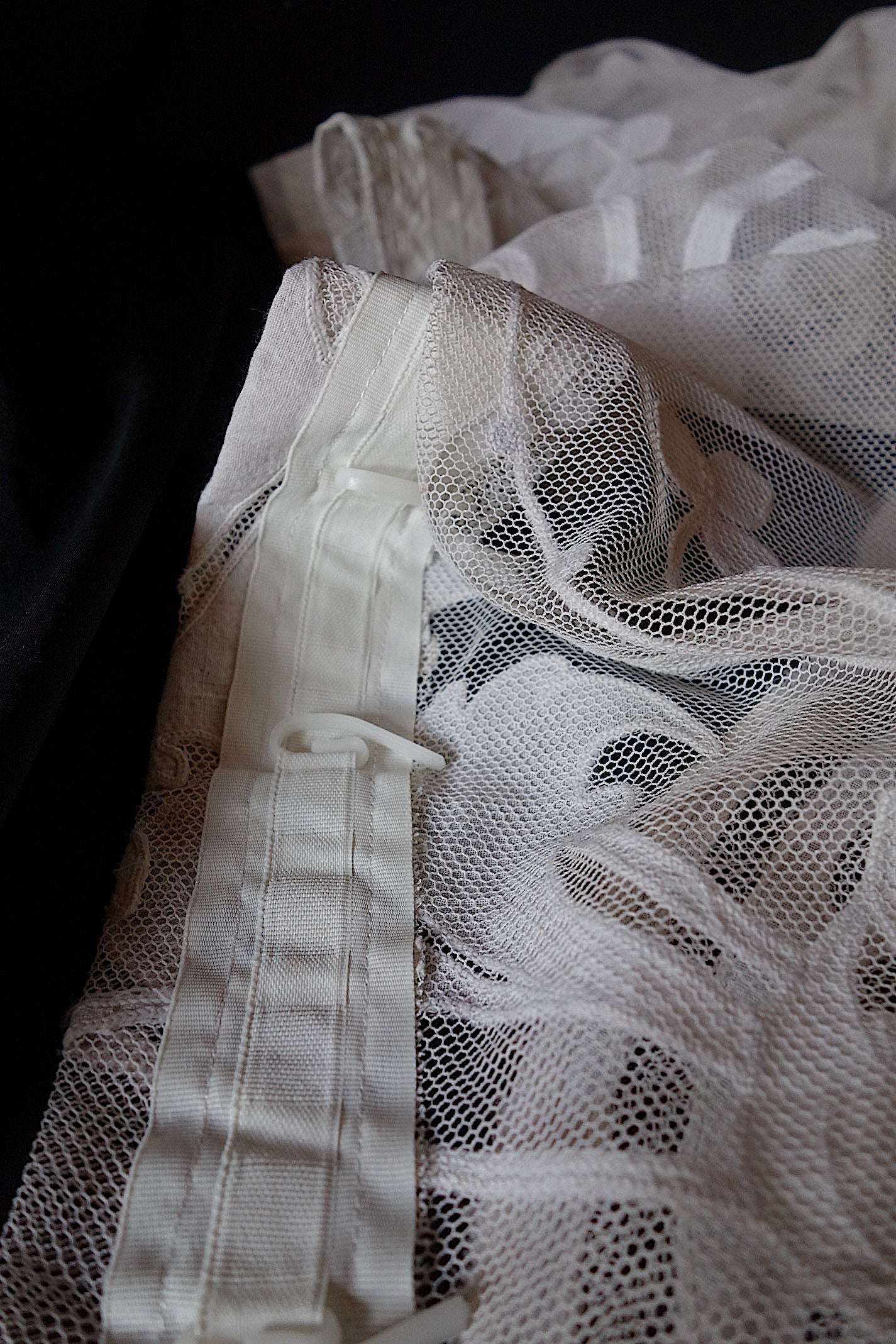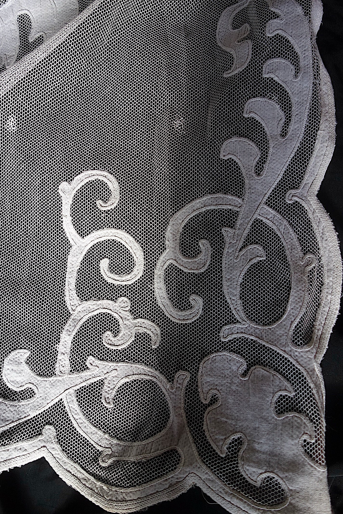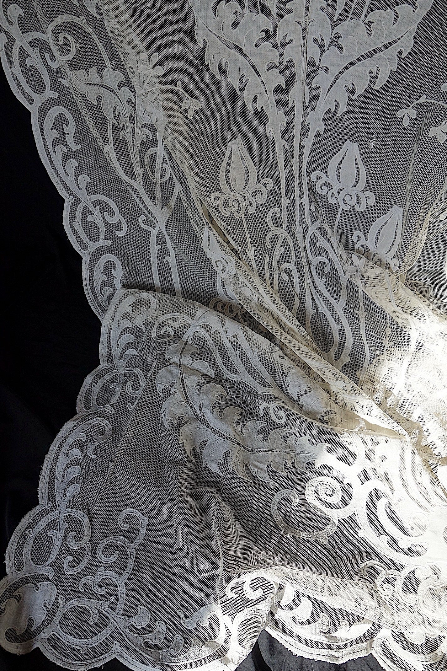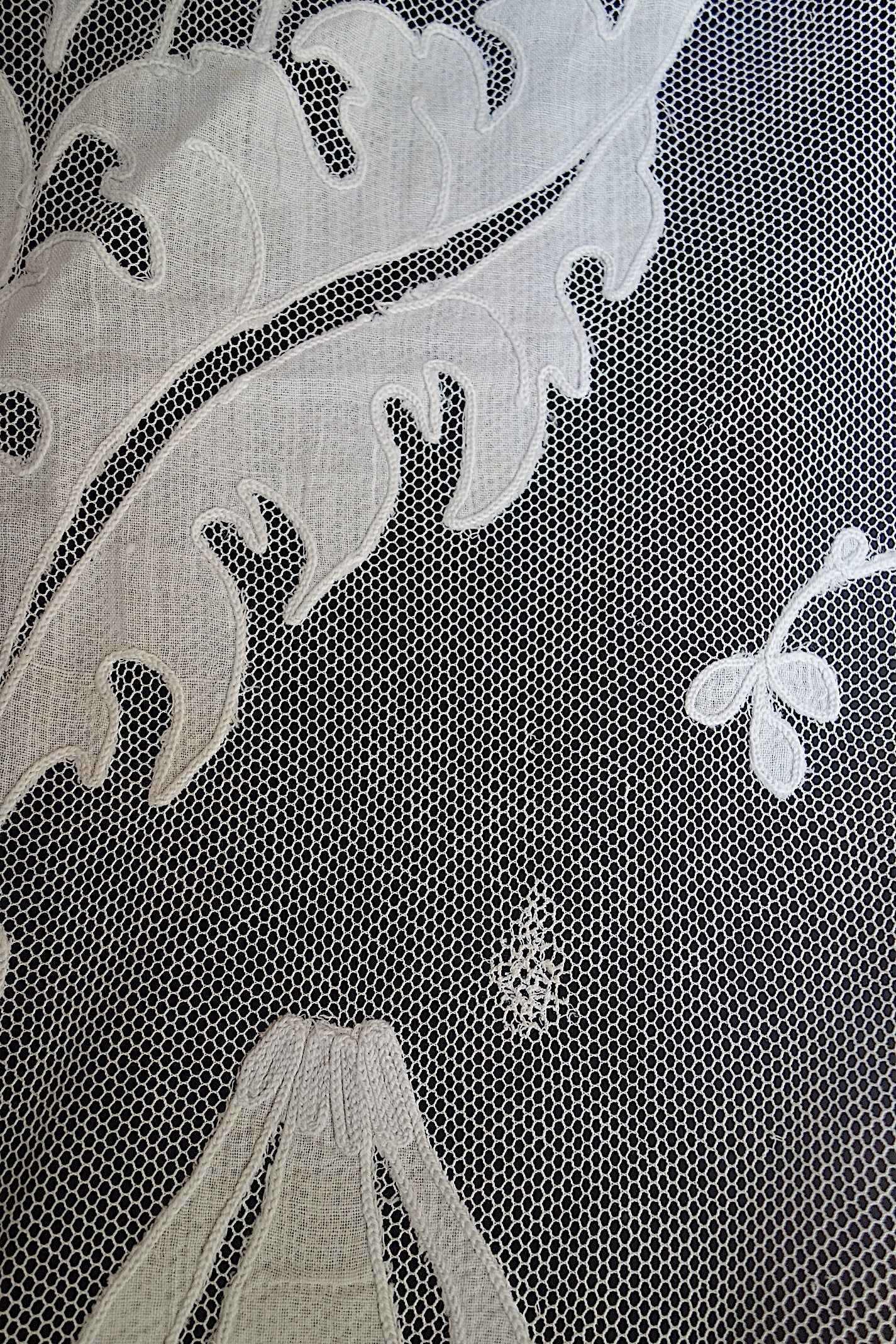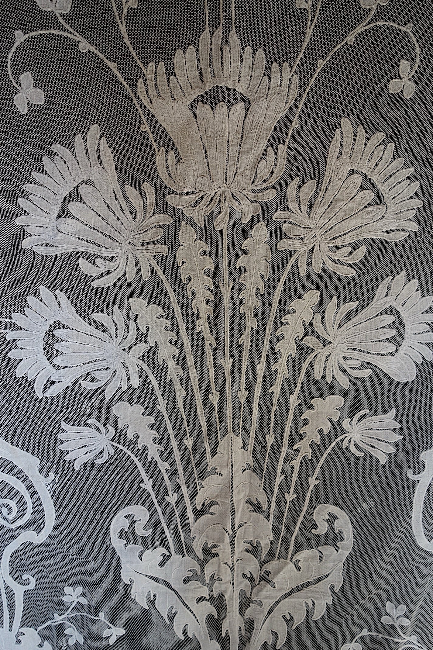 メッシュ地に描かれた優雅な花の曲線が、空間に洗練された表情をもたらすアンティークカーテン。透光性に優れたメッシュ素材が柔らかな光を通しながら、大振りな花モチーフが壁面に影を落とし、昼夜で異なる表情を演出します。モダンなインテリアにも調和する上質な一枚。窓辺に歴史と美しさを纏わせる、こだわりの逸品です。上辺には使いやすいようにカーテンフックが付いています。メッシュに補修が多々入っています。