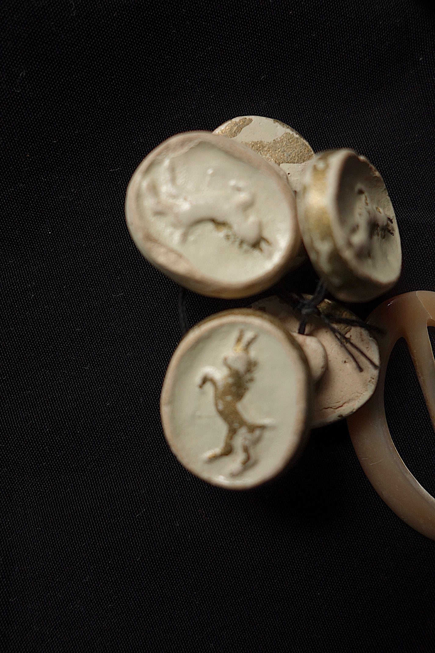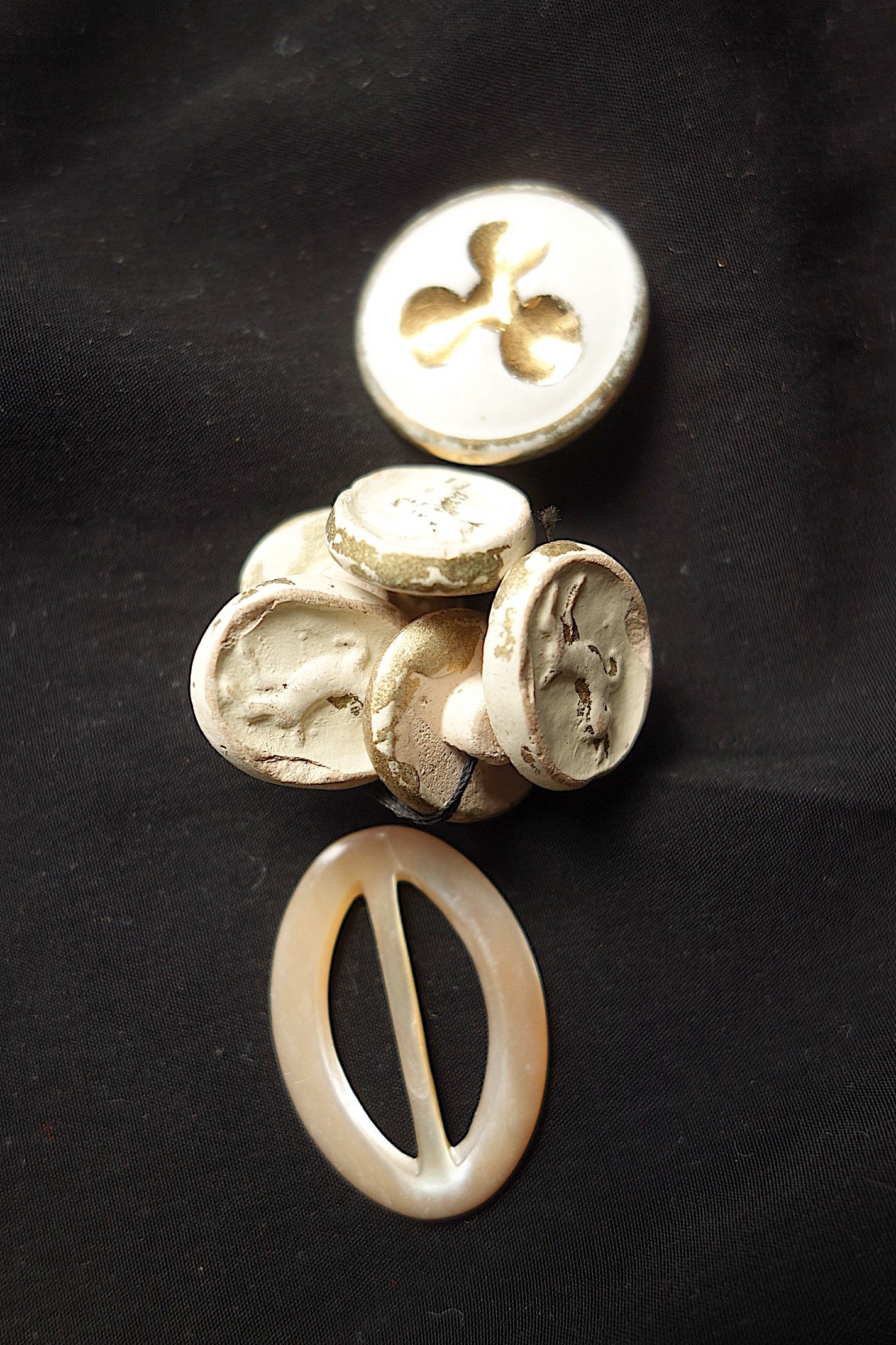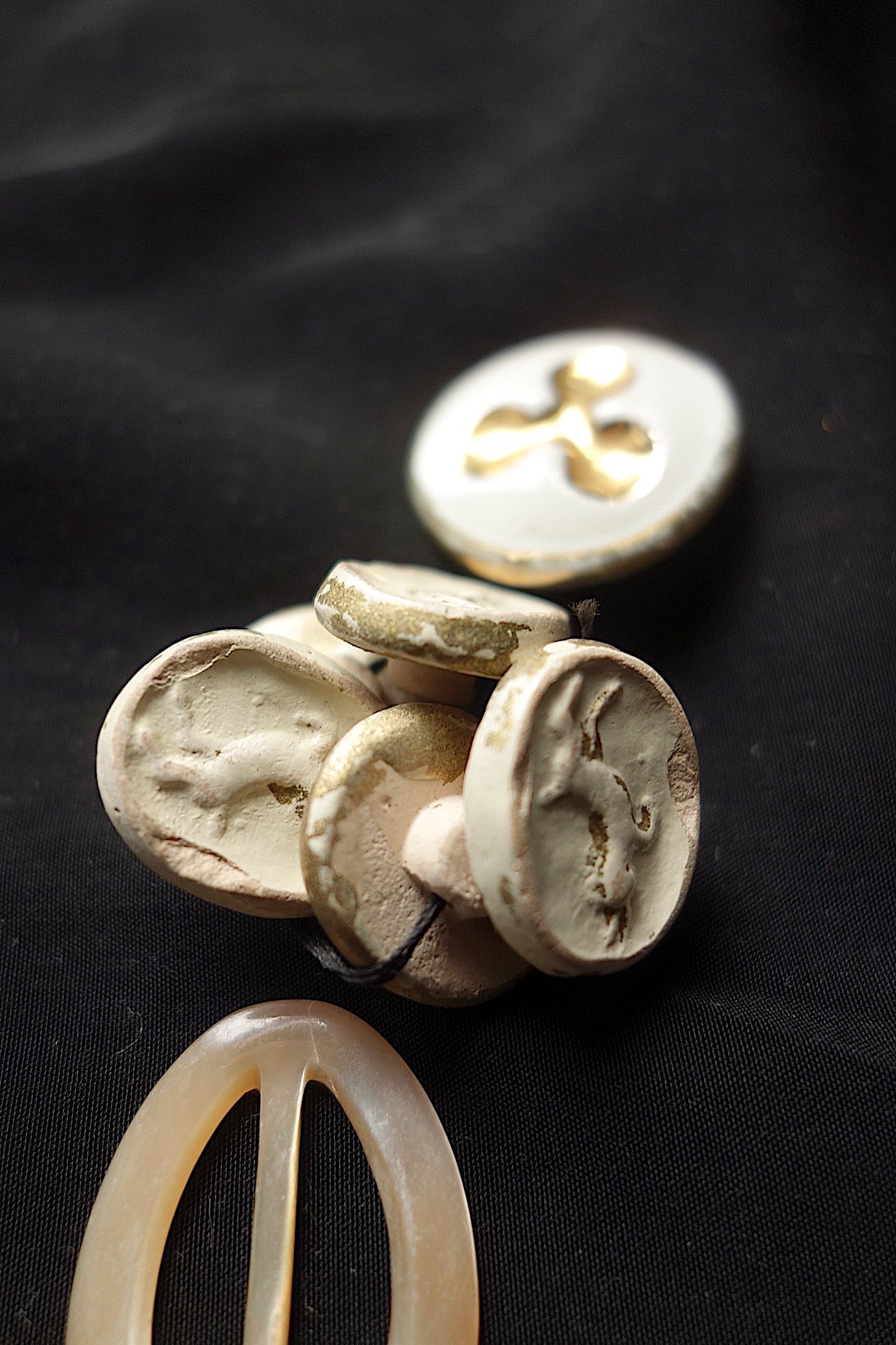 セラミックのユニコーンの柄の珍しいボタンと三つ葉がら。