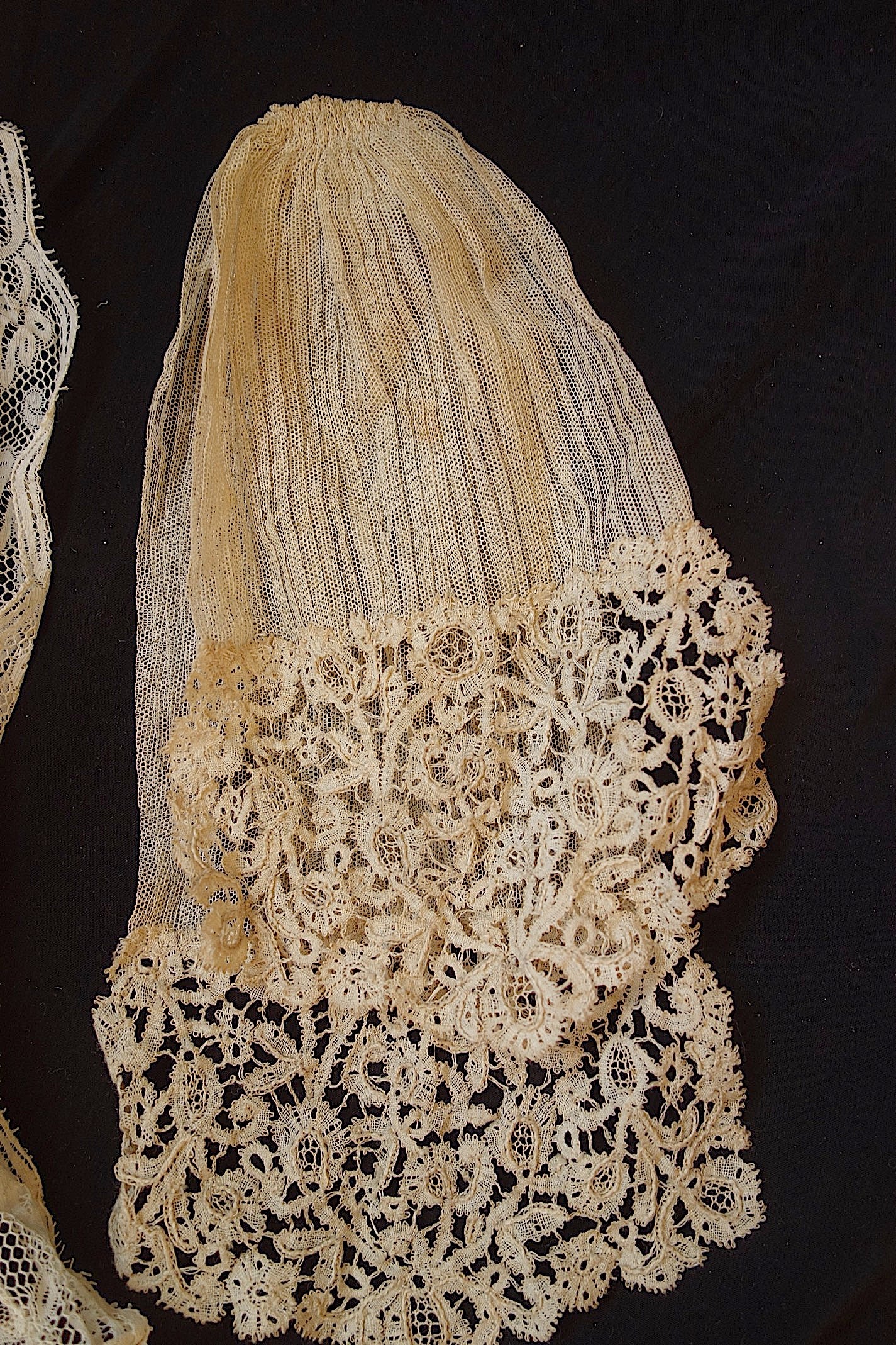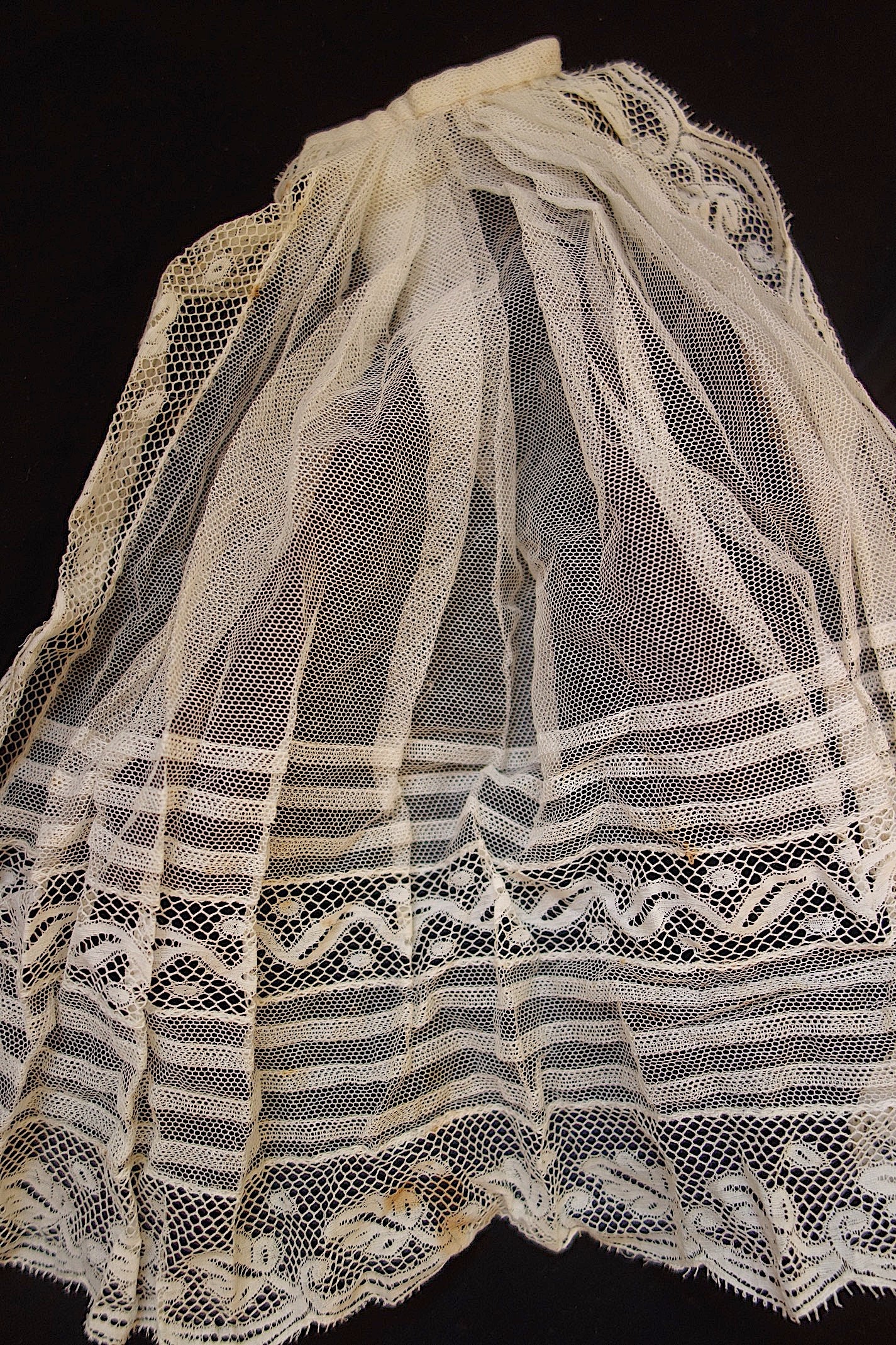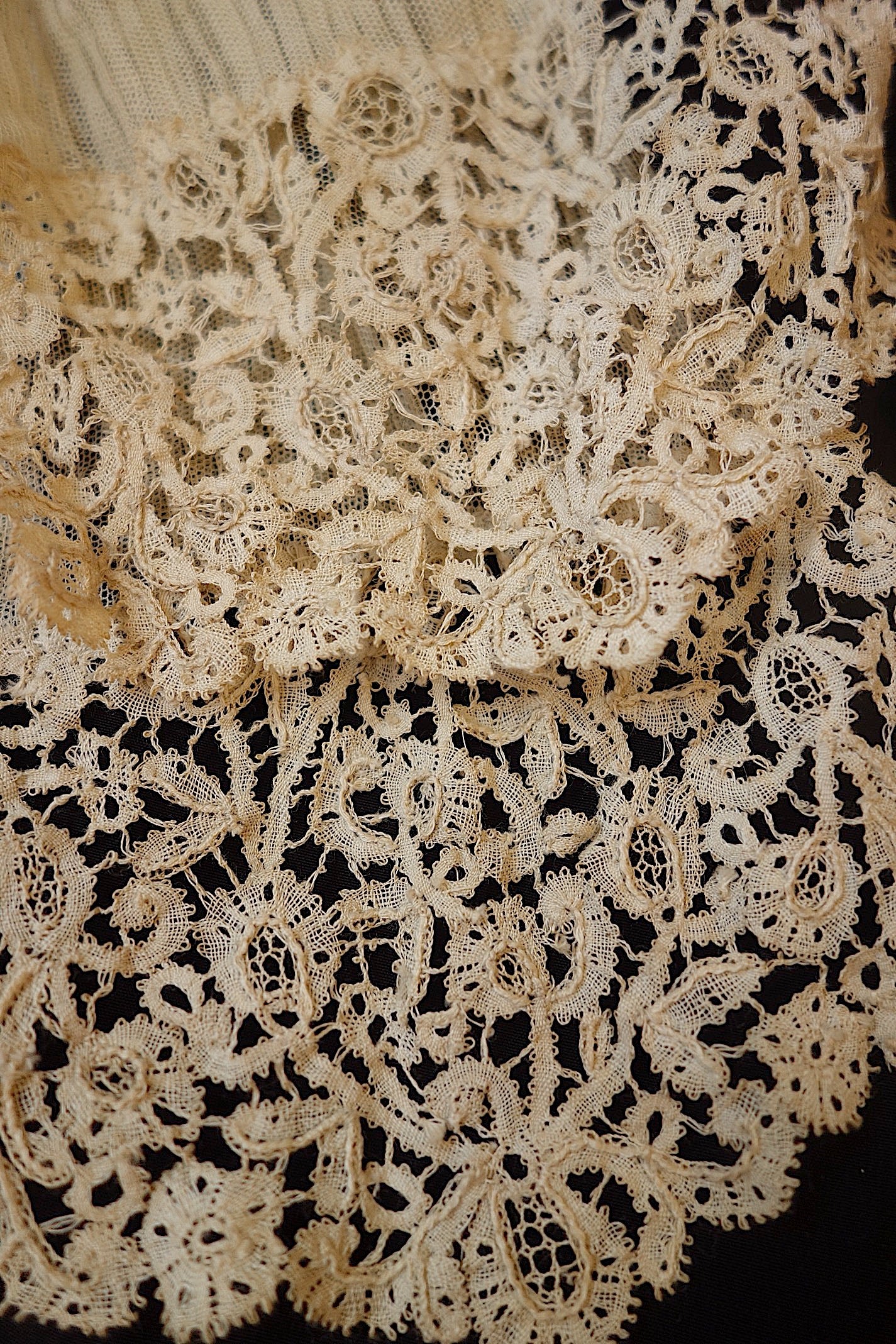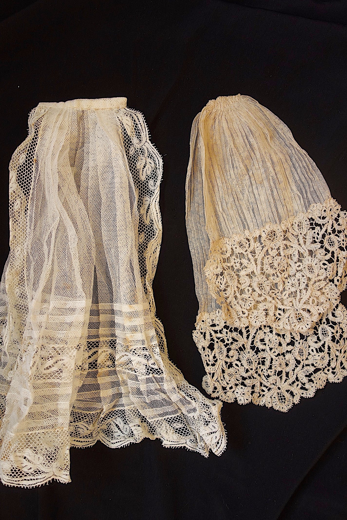 細かいプリーツ、ギャザーの寄った2つのジャボ。特にプリーツの方は、ロザリンレースでの装飾で、一層繊細さが増します。