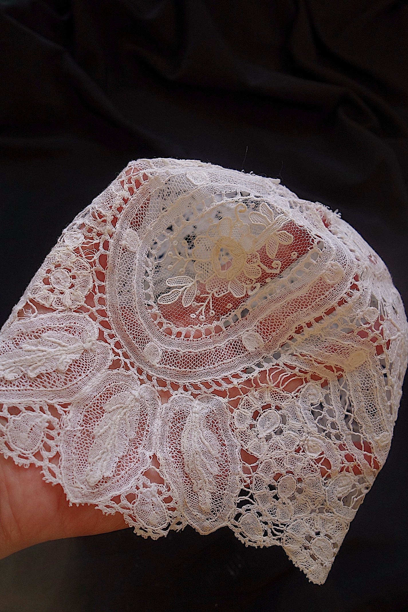 ホニトン・ブリュッセルレースを贅沢に使用した、大人向けのアンティークボネです。繊細な手編みレースの透け感と立体的なドレープが、顔周りを優雅に演出します。19世紀のテクニックが息づく一点物で、素材に、また特別な装いのアクセントとして活躍します。サイズに余裕を持たせた設計で、かぶり心地も快適。時を超えた美しさを身にまとう喜びを感じてください。