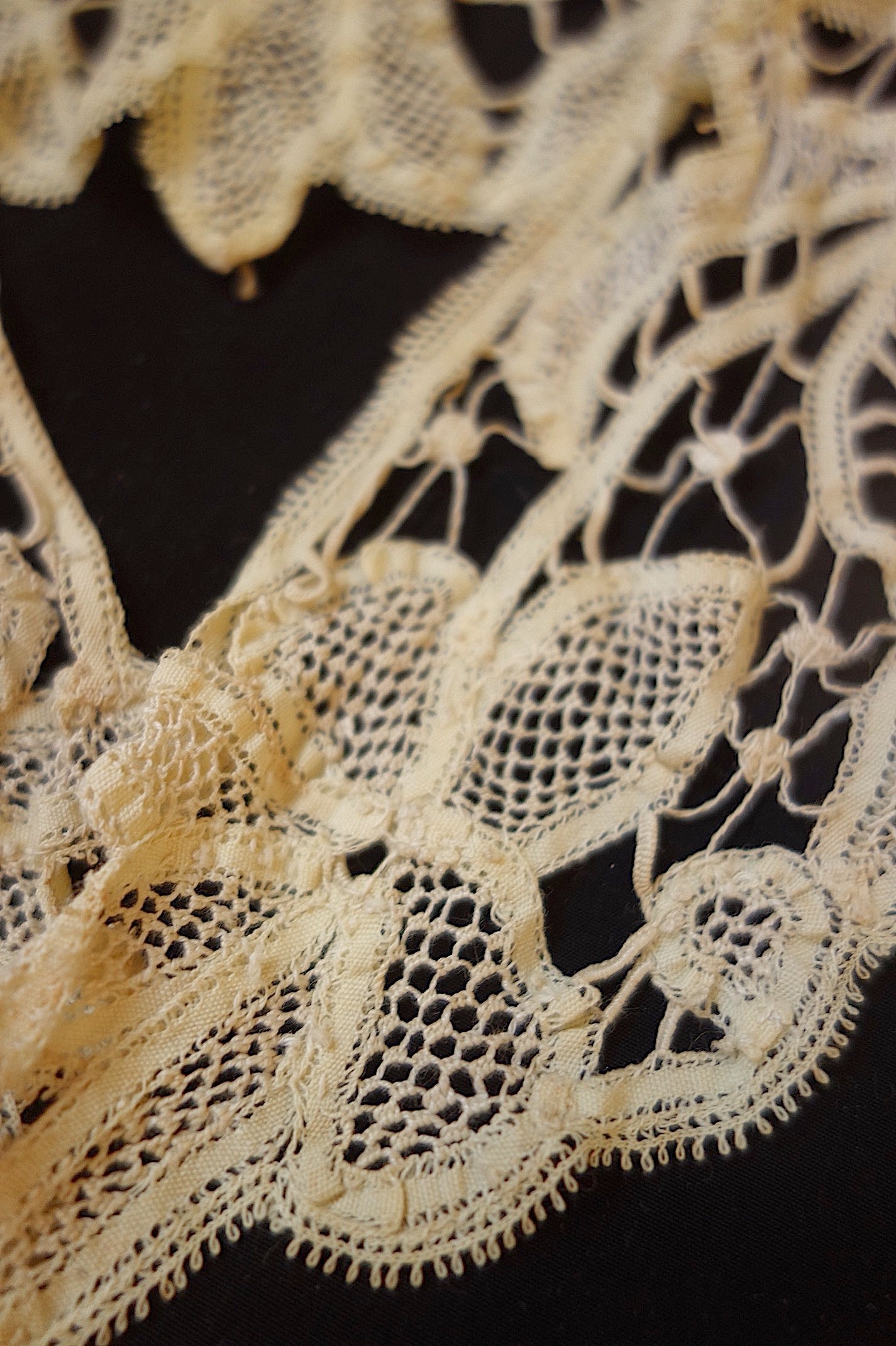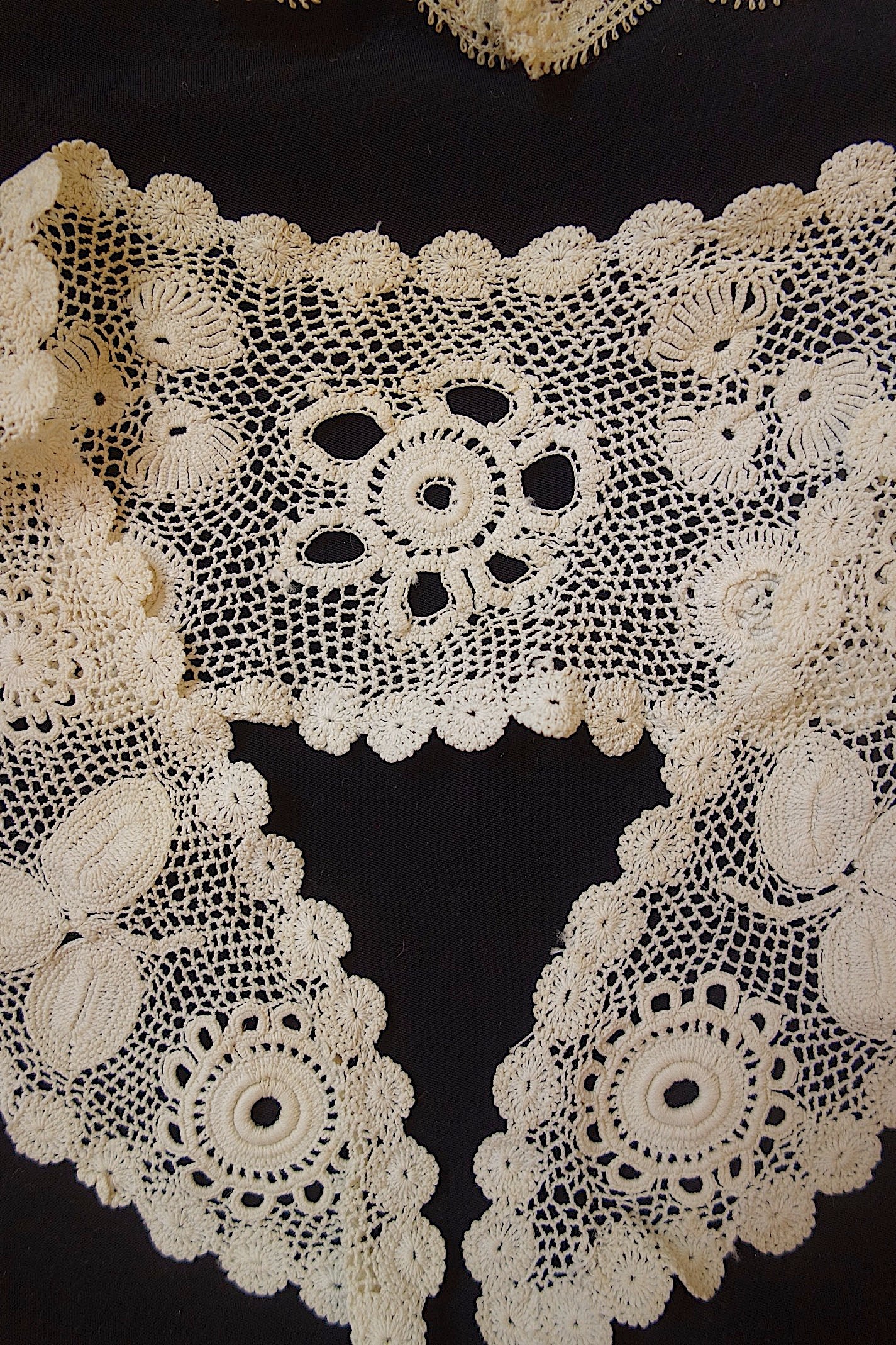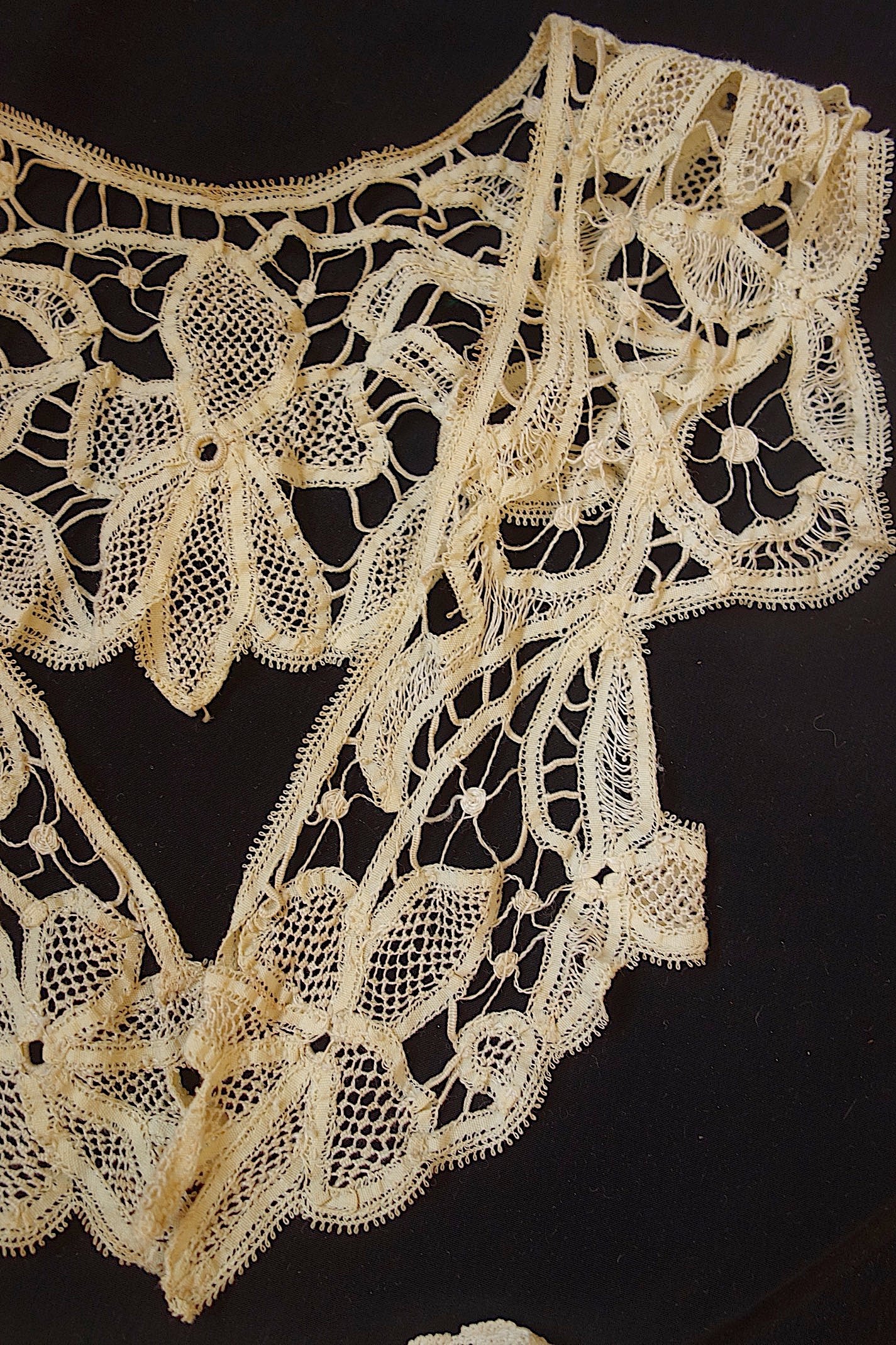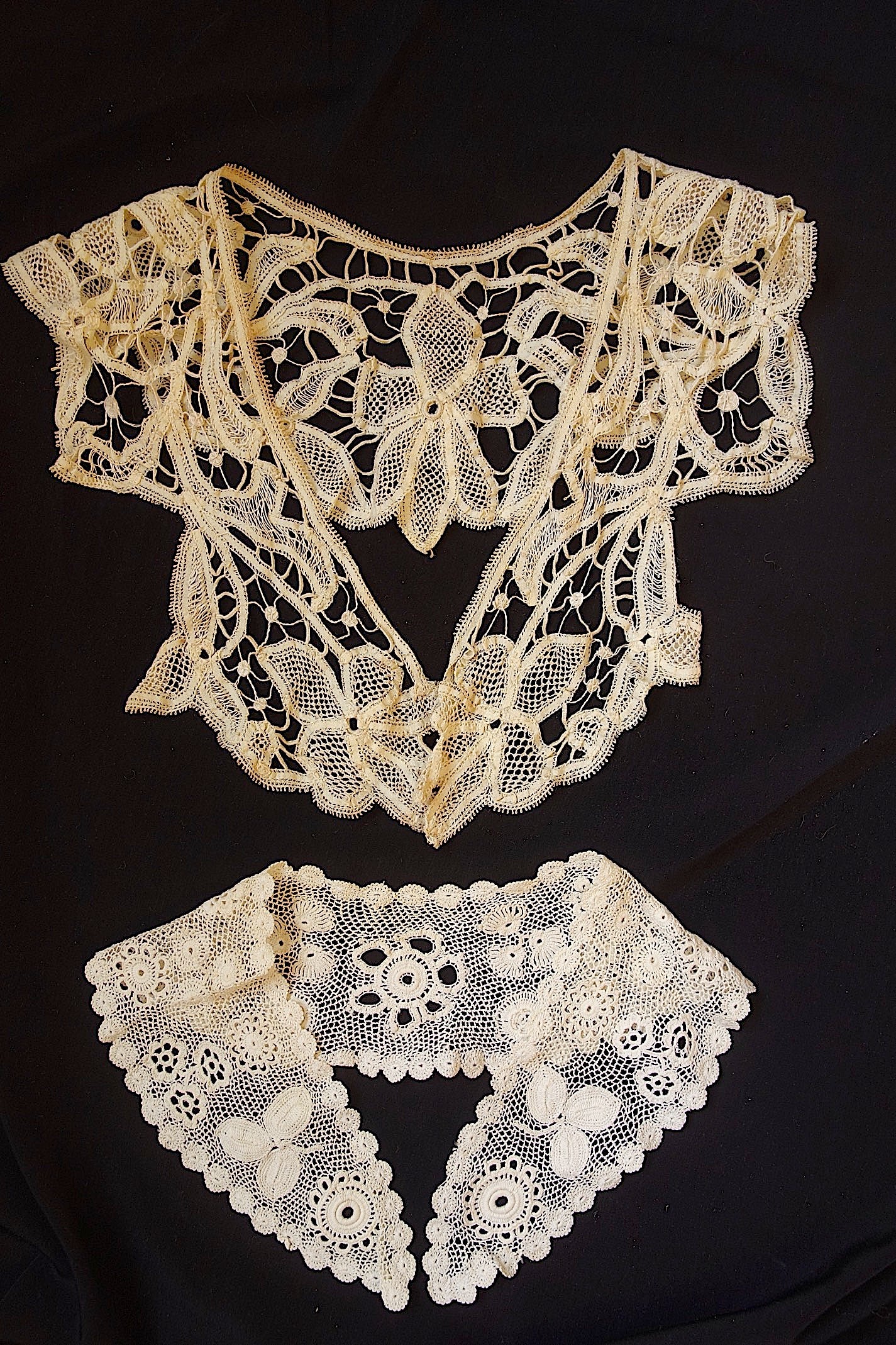 テープを使って自由自在にモチーフを作り上げるブロードレース襟と、細かい目のクロシェレース襟。素材にも