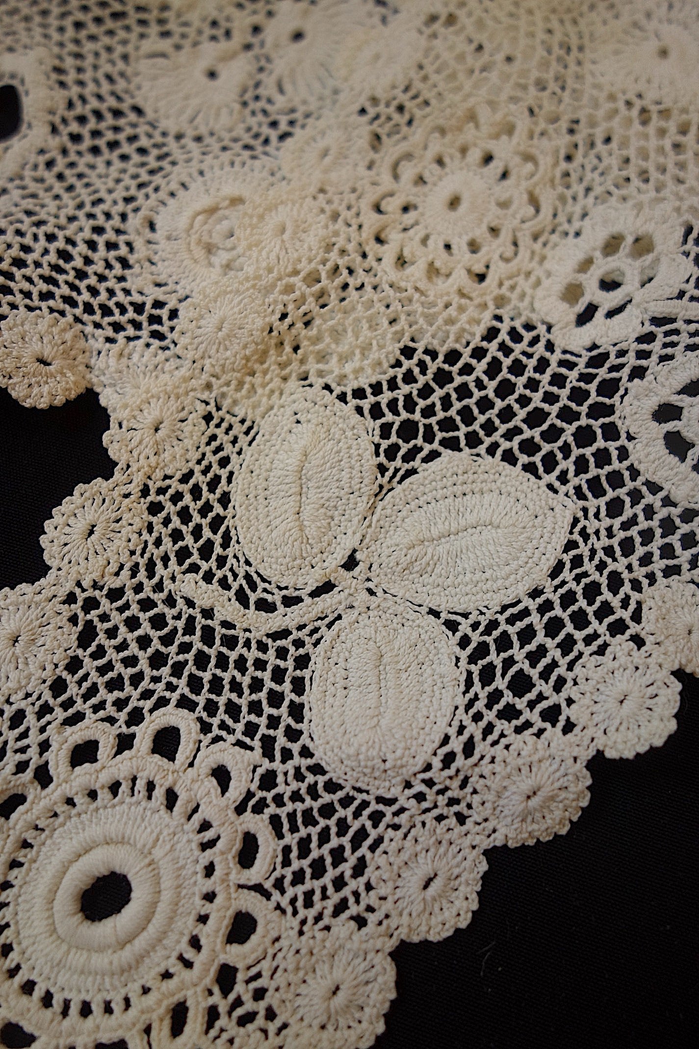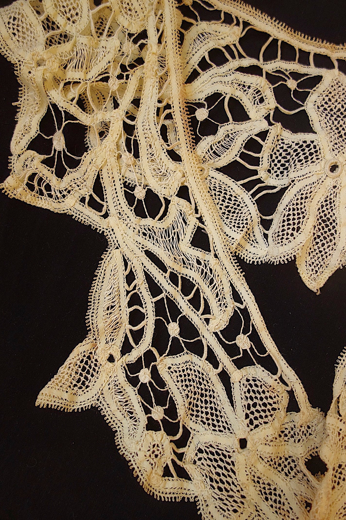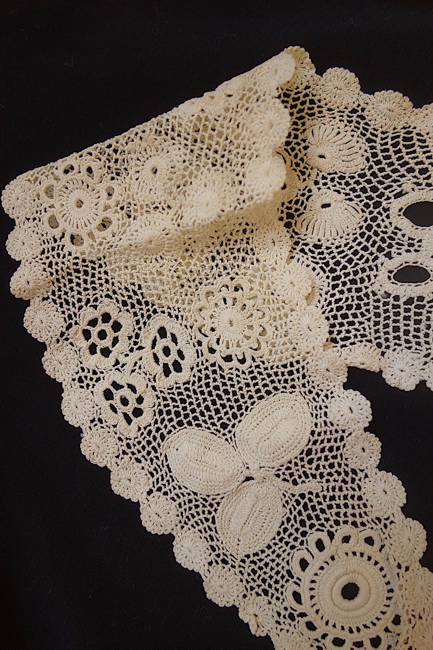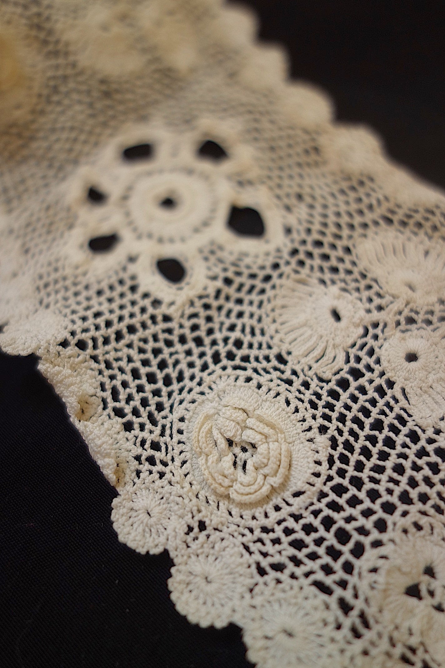 テープを使って自由自在にモチーフを作り上げるブロードレース襟と、細かい目のクロシェレース襟。素材にも
