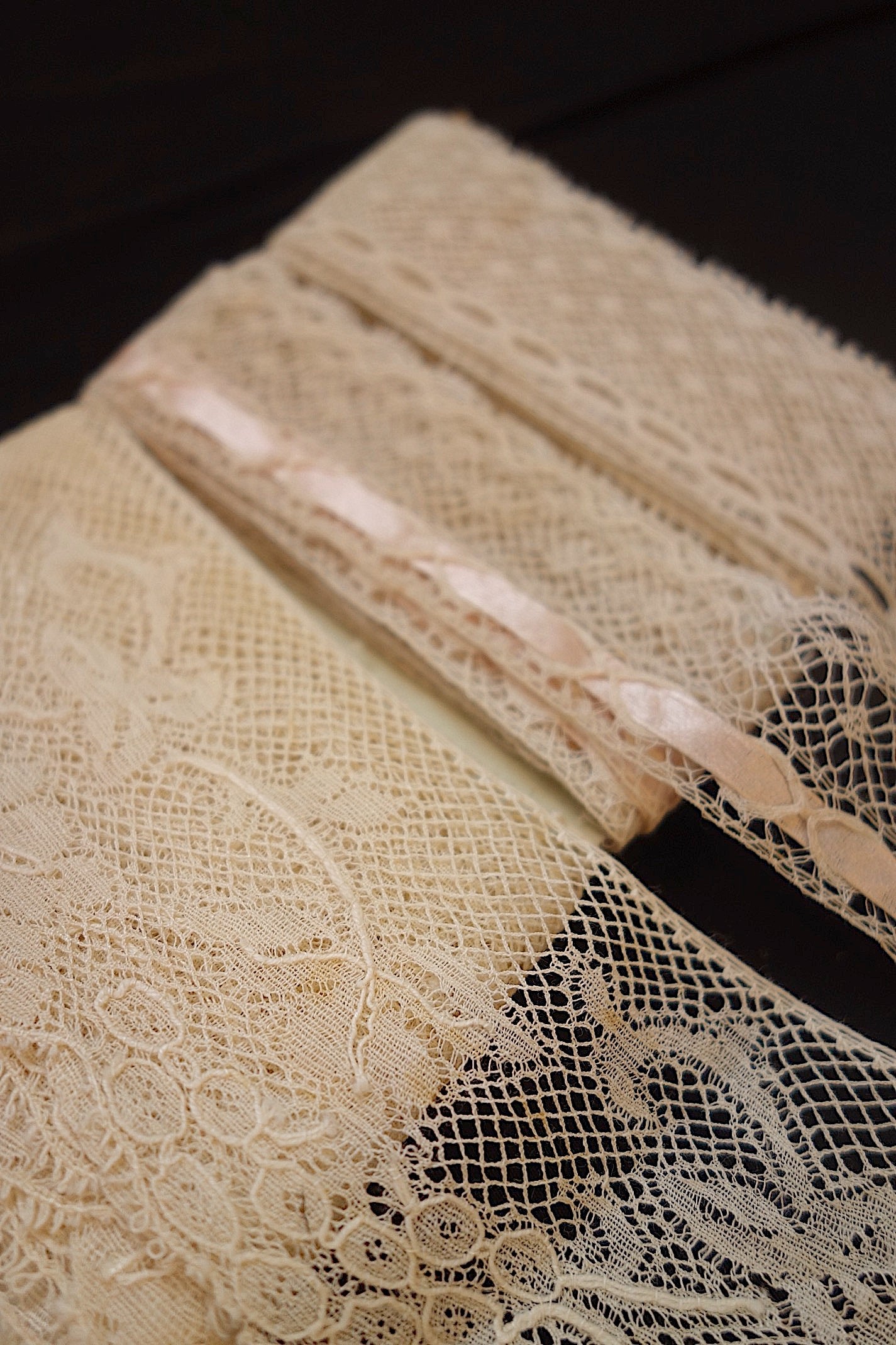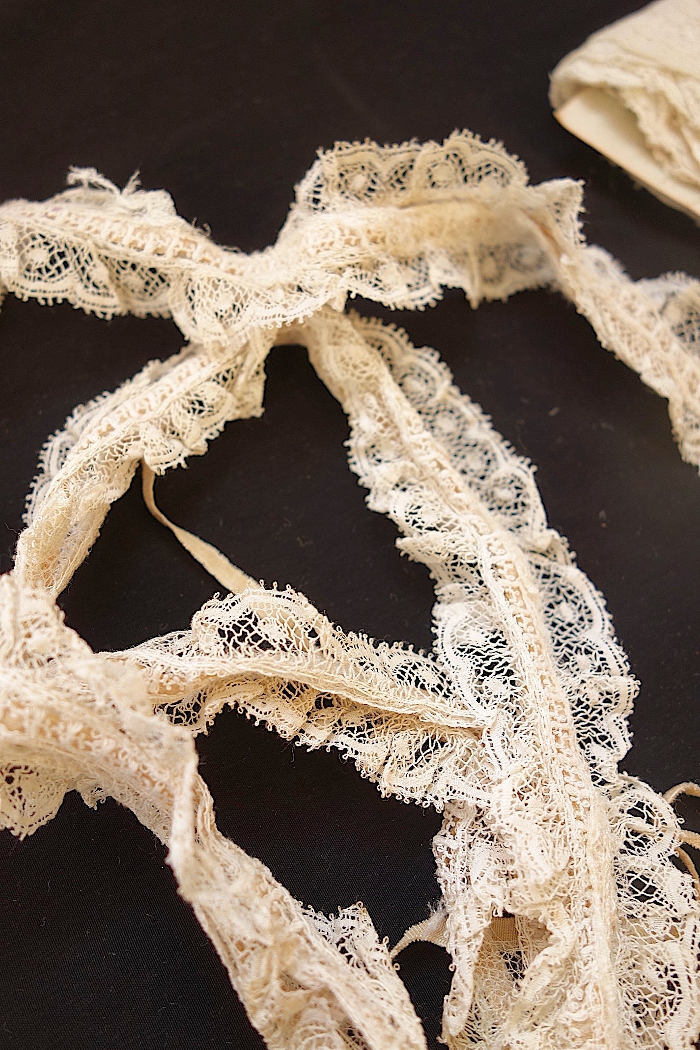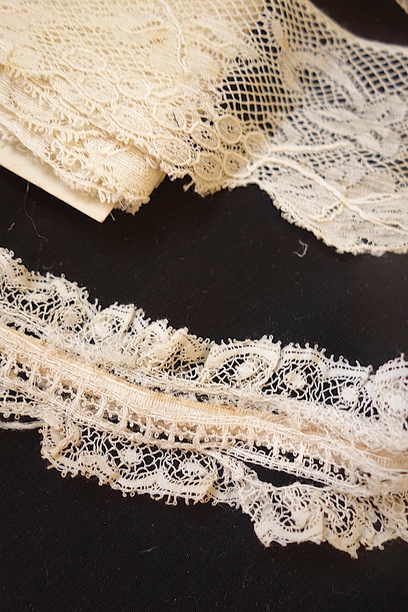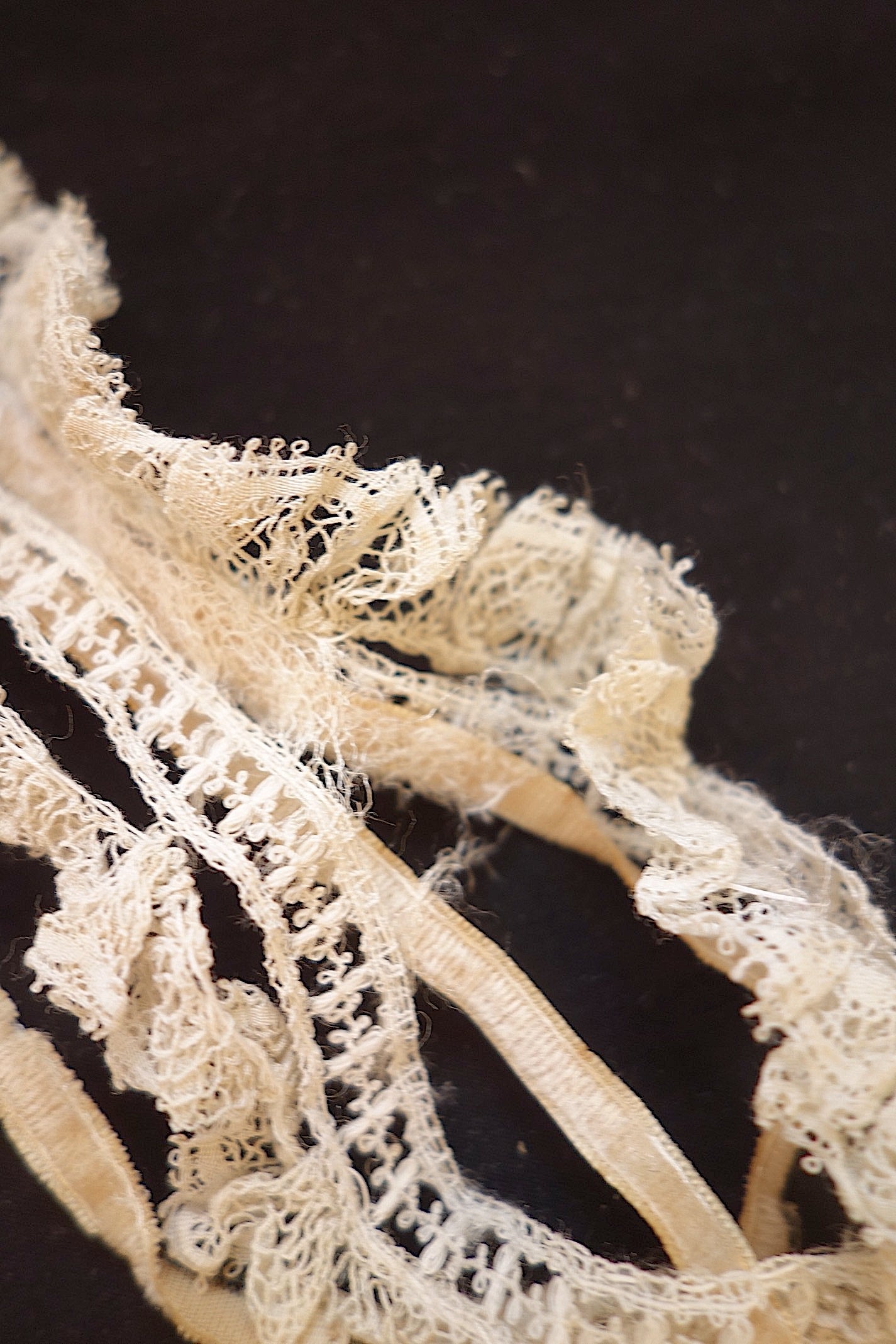 アンティーク洋服では、必ずといっていいほど使われているレースです。小さなテープがすでに入っているレースもあります。下の段がついているレースはレース同士の離れが見られますが、このまますぐにでも素材として活用したいレース。