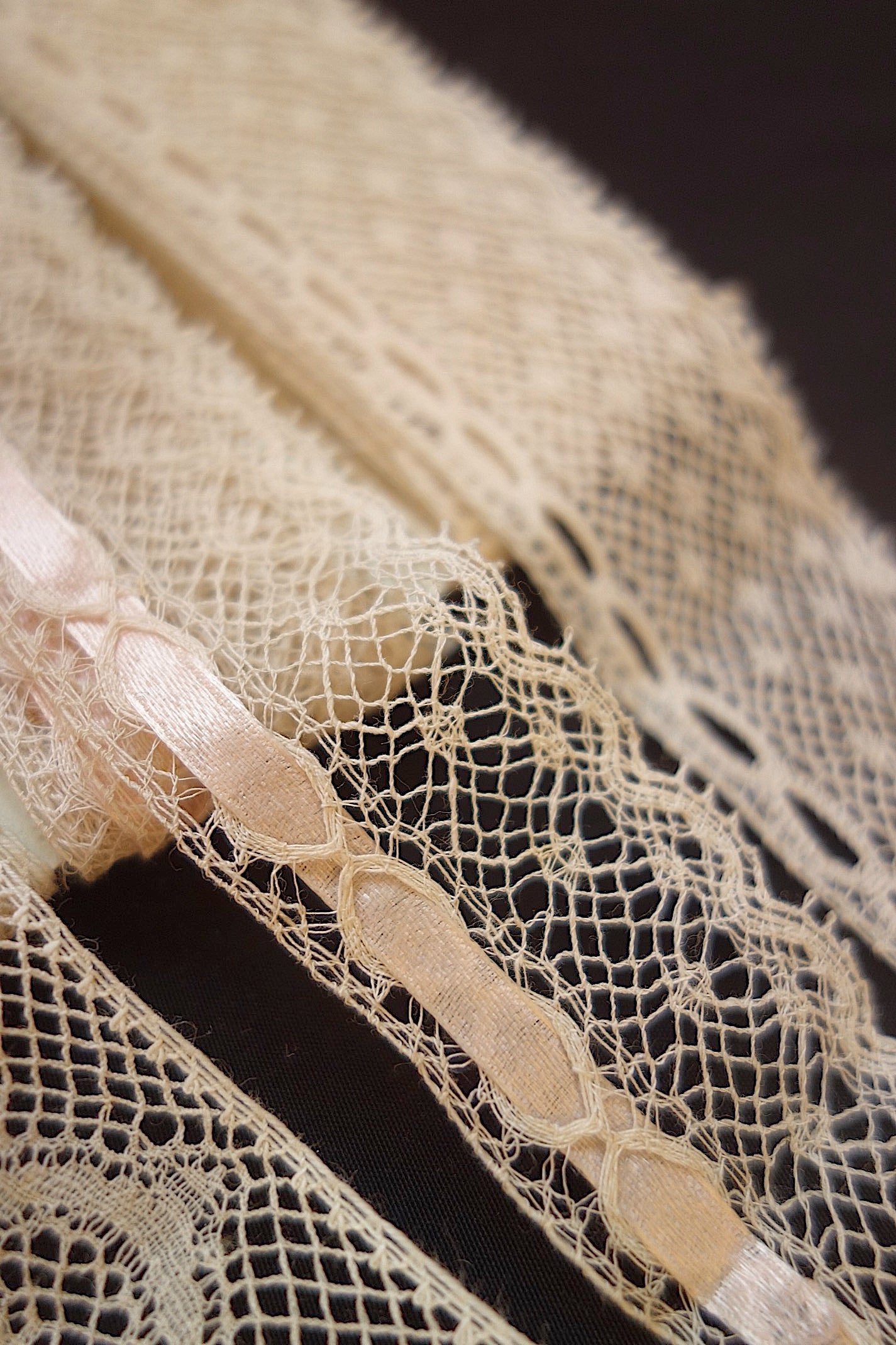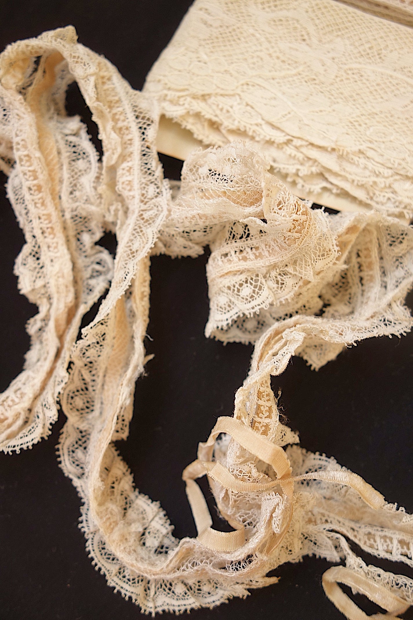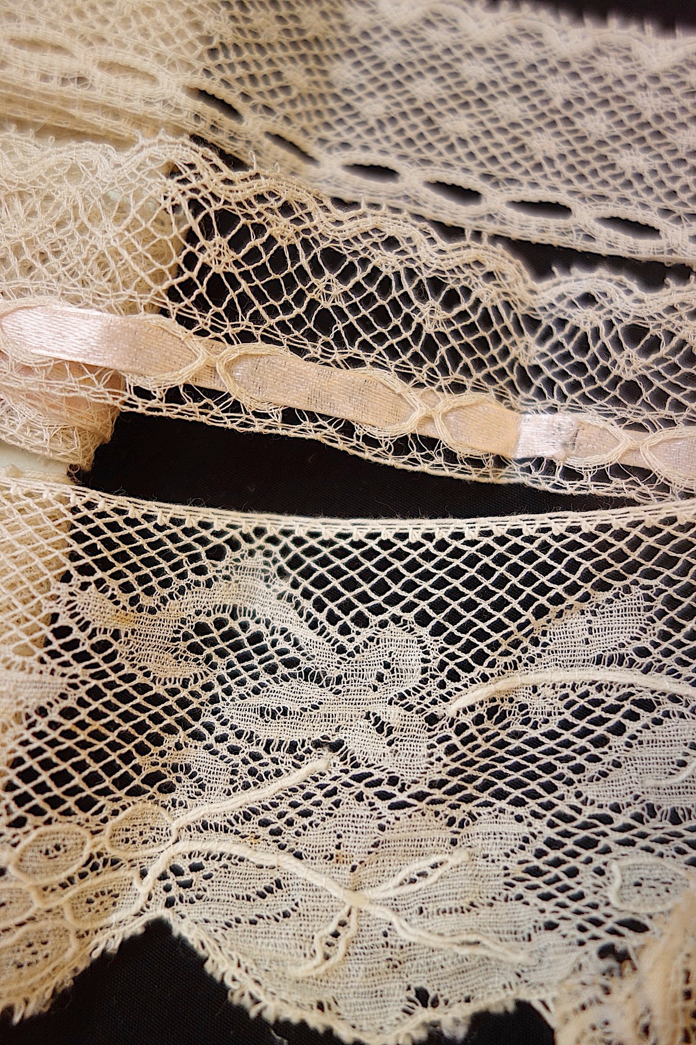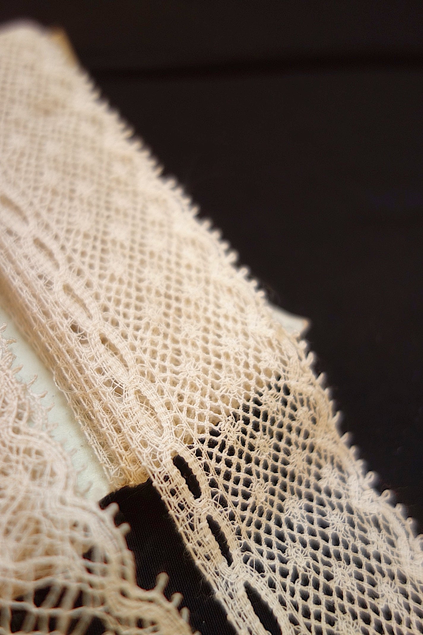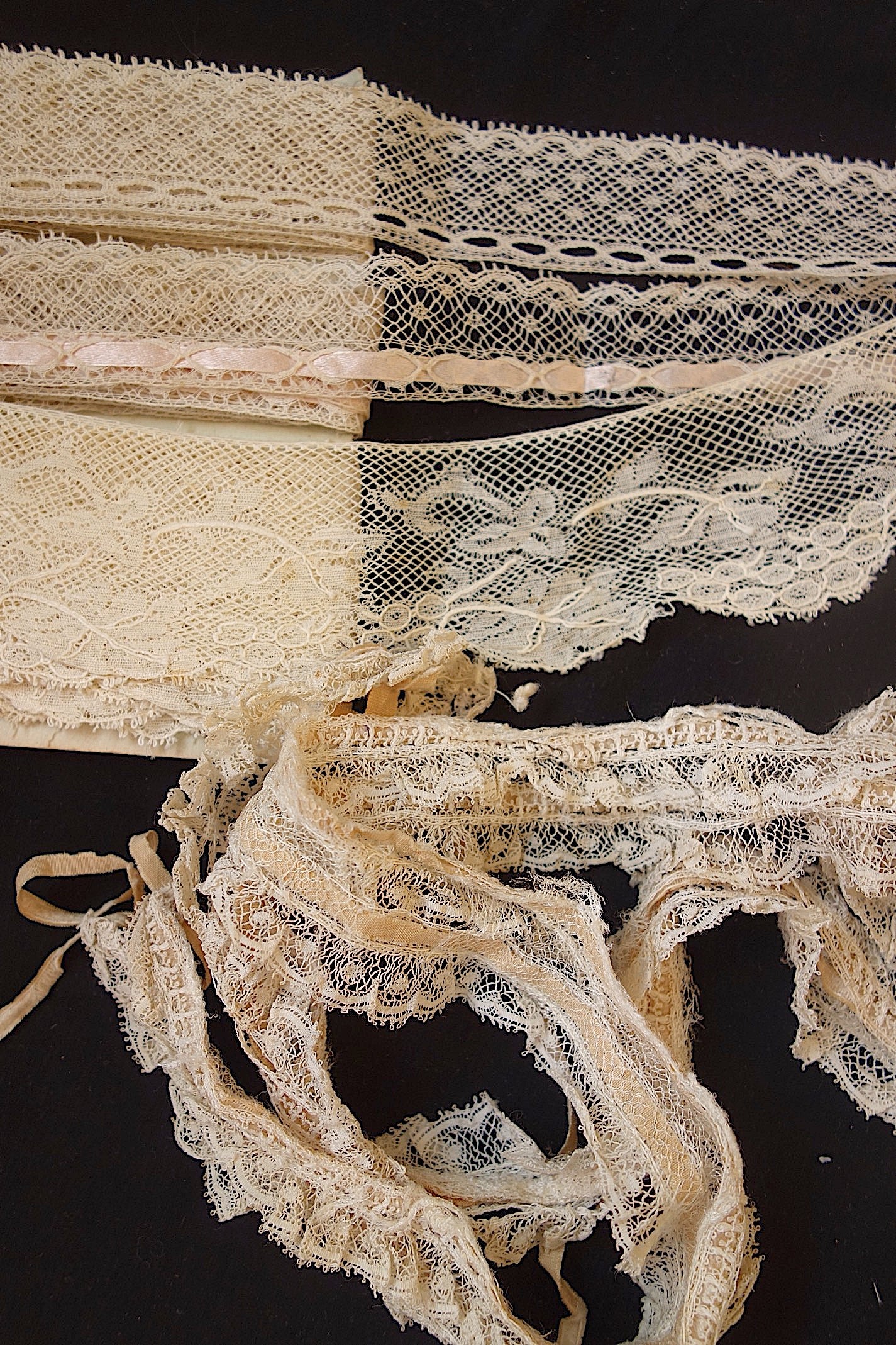 アンティーク洋服では、必ずといっていいほど使われているレースです。小さなテープがすでに入っているレースもあります。下の段がついているレースはレース同士の離れが見られますが、このまますぐにでも素材として活用したいレース。