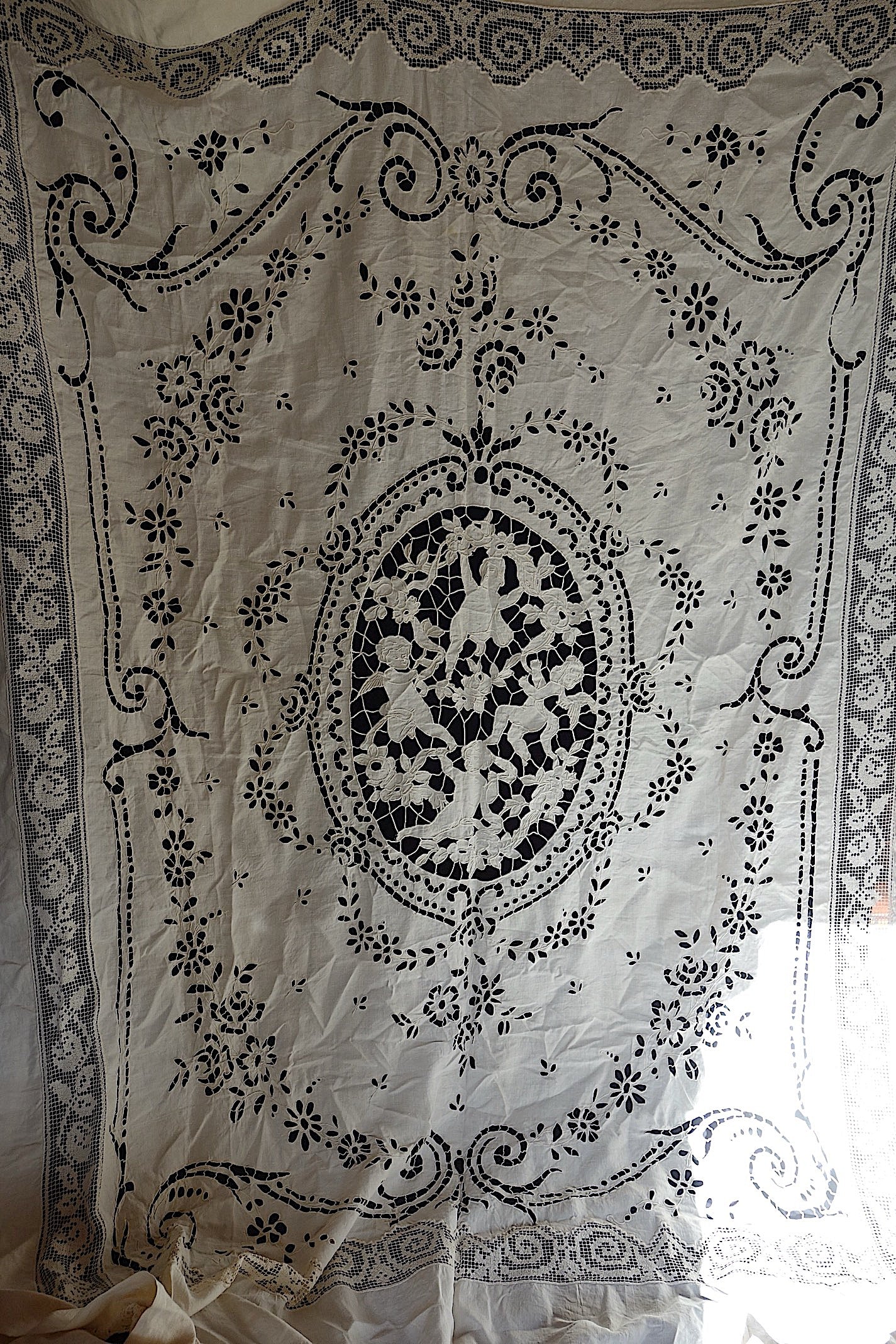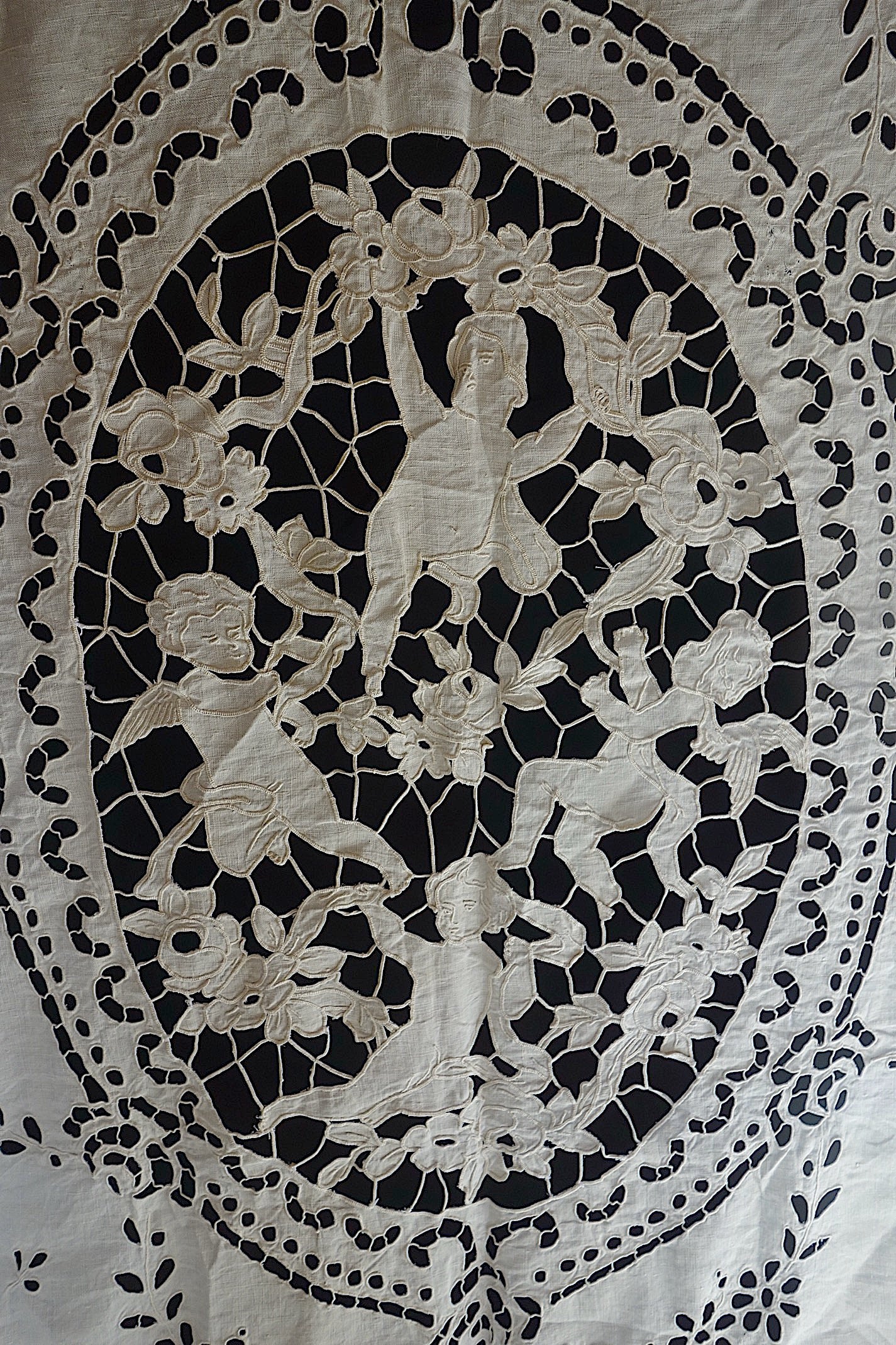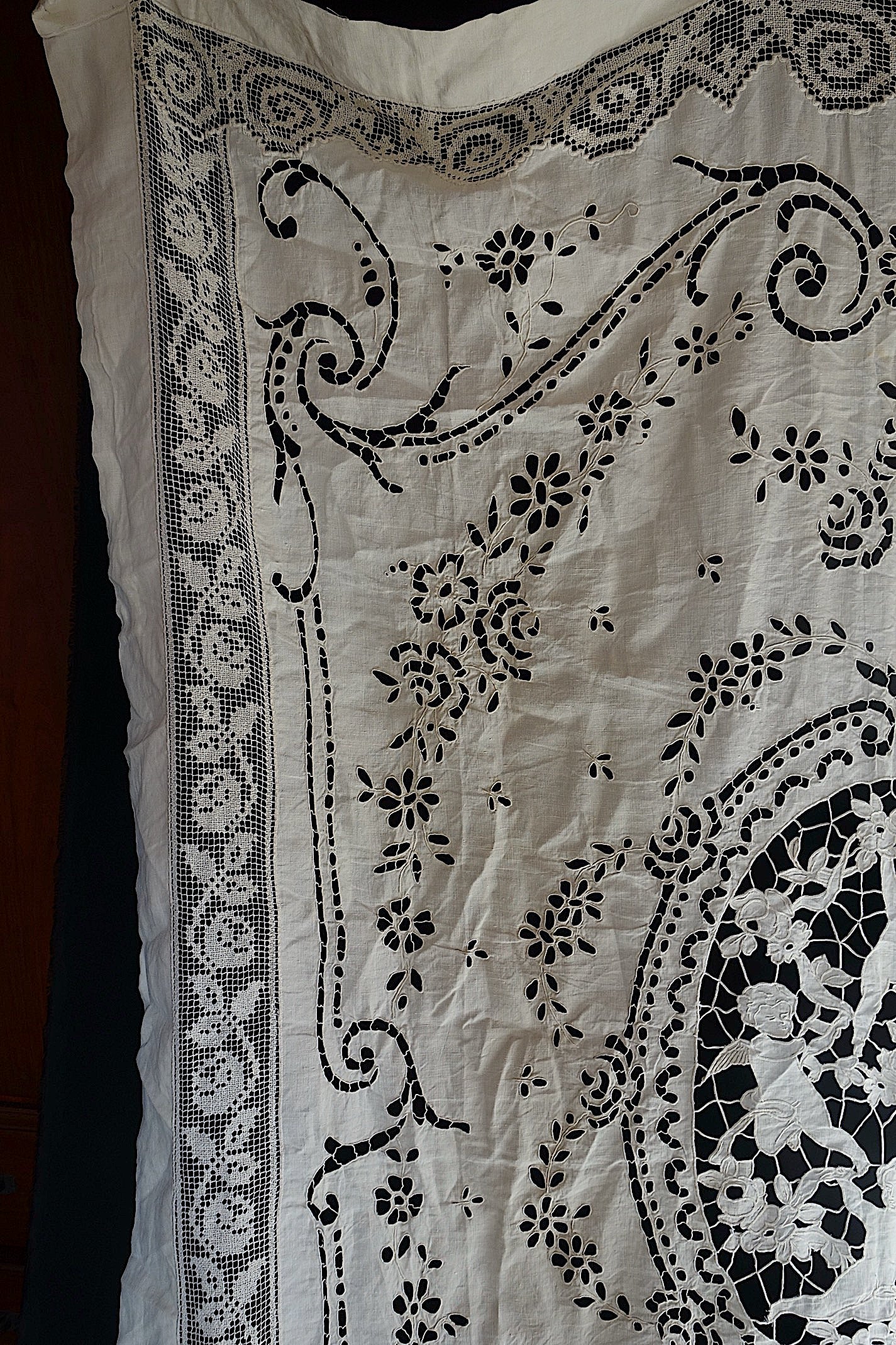 天使の刺繍モチーフが優雅に施された、アンティークカーテンです。大きく描かれた天使のデザインが、お部屋に格調高い雰囲気と物語性をもたらします。アンティーク刺繍の繊細な手仕事が光る逸品で、窓辺を美しく彩りながら、インテリアに深みと個性を加えます。クラシックな魅力と現代的な空間の融合を実現する、こだわりのあるお客様のための選択肢です。大きなお屋敷にあったクロスです。