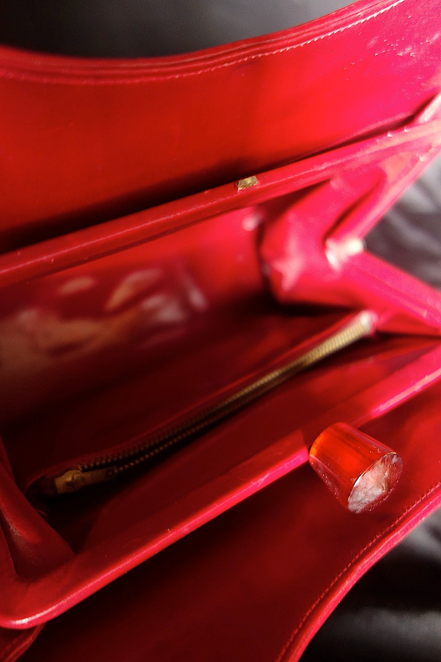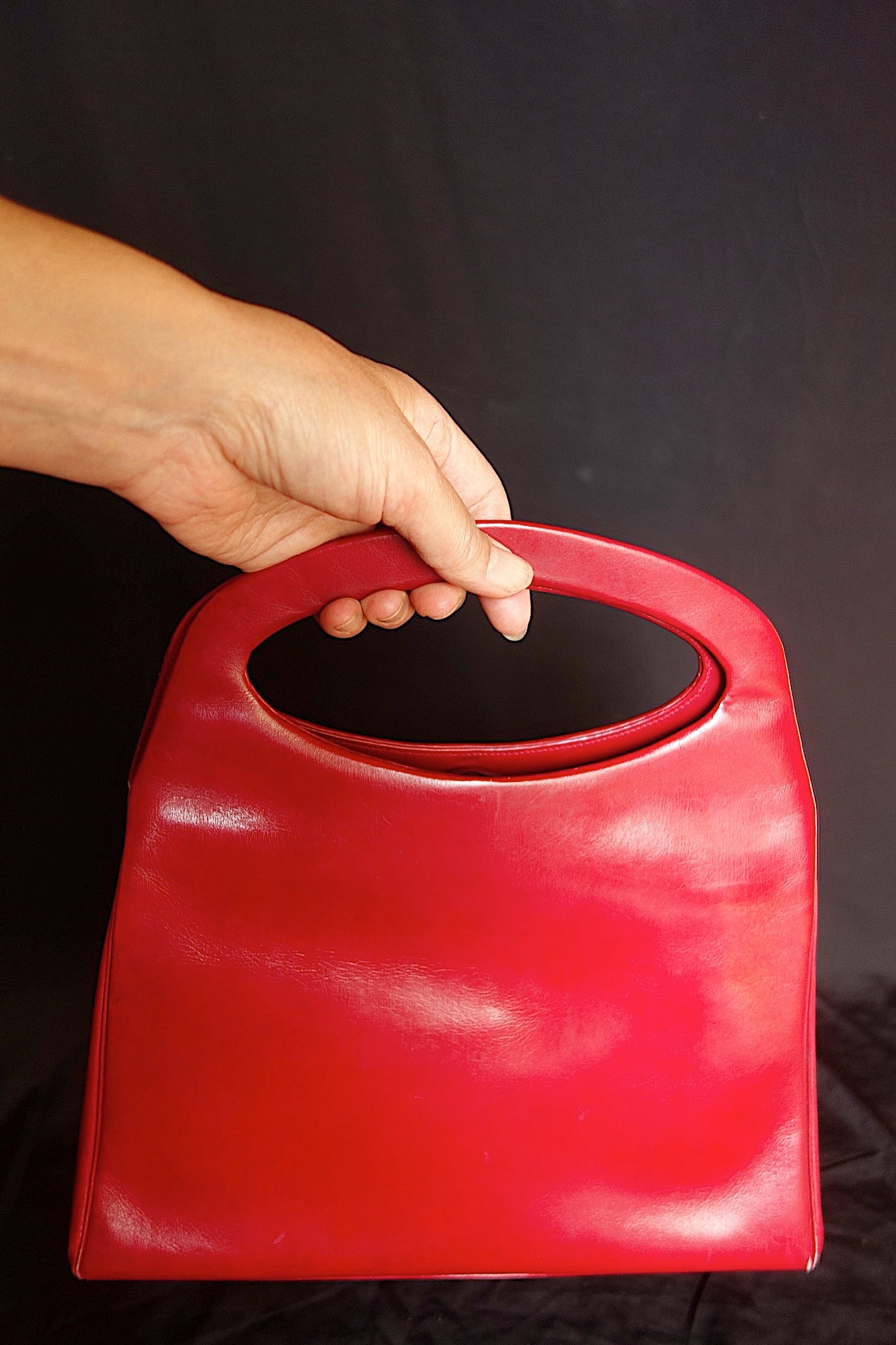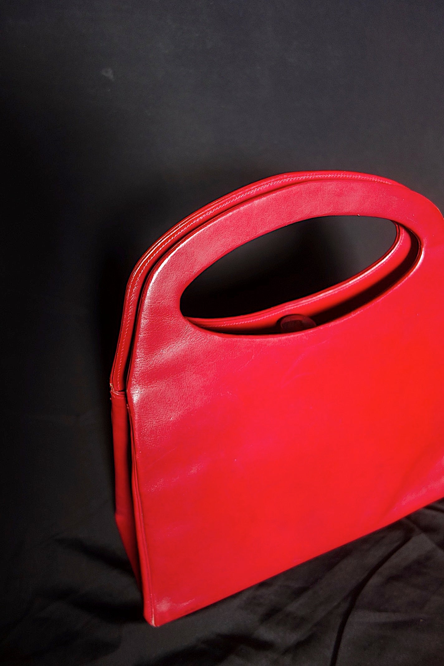 鮮やかな赤のポイントに持つのにぴったりなバッグ。箱型というか、本体とハンドのに継ぎ目のないどこか惹かれるデザイン。がま口はバケリットで両サイドもポケットがあり、とても使いやすいです。