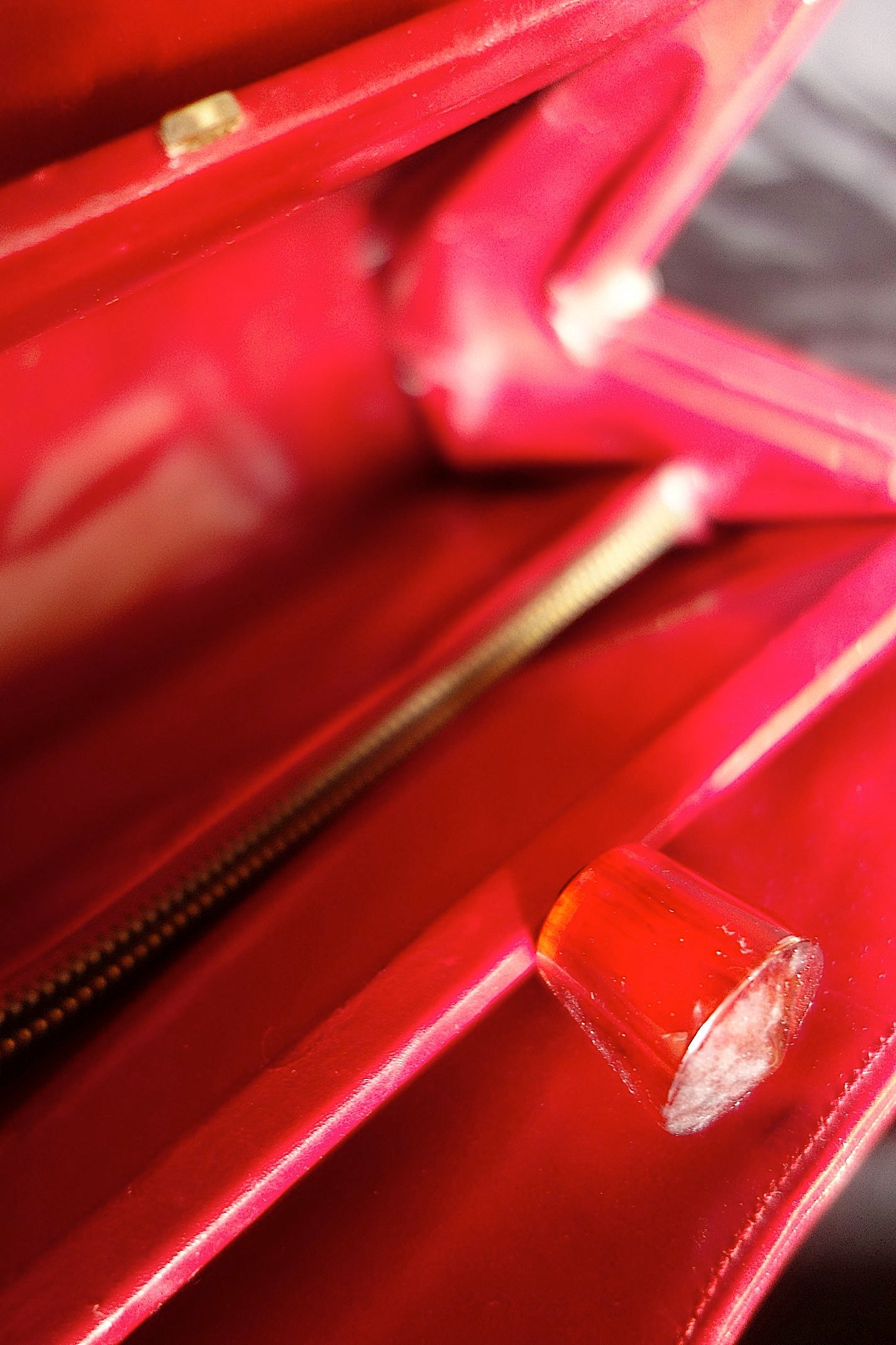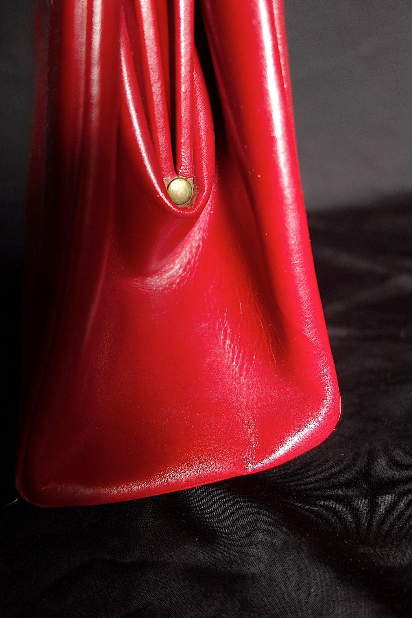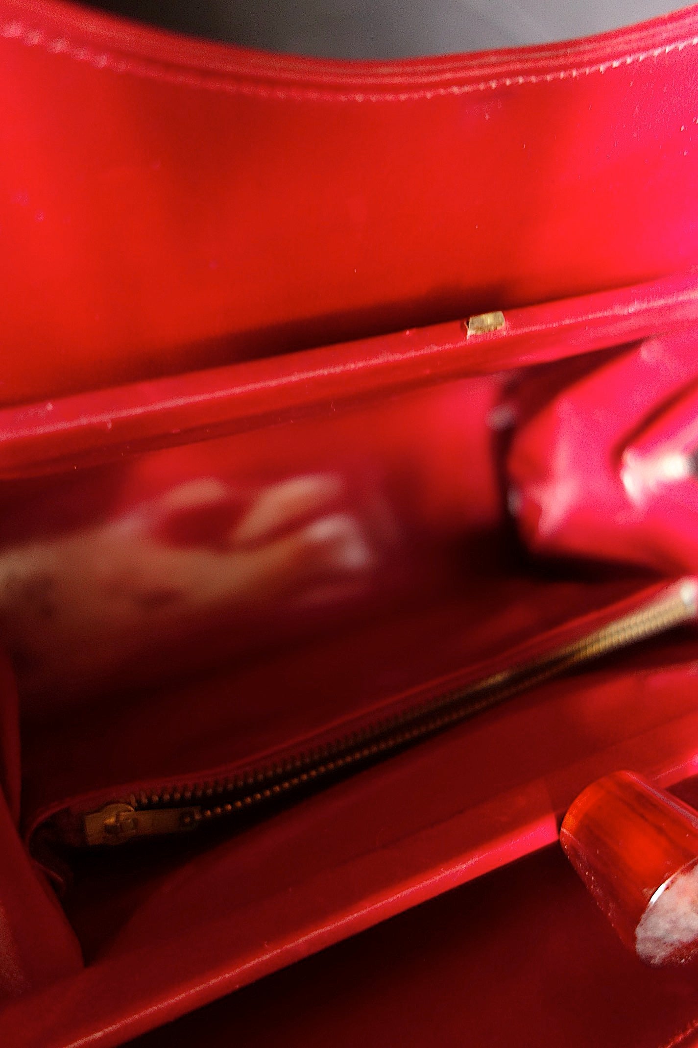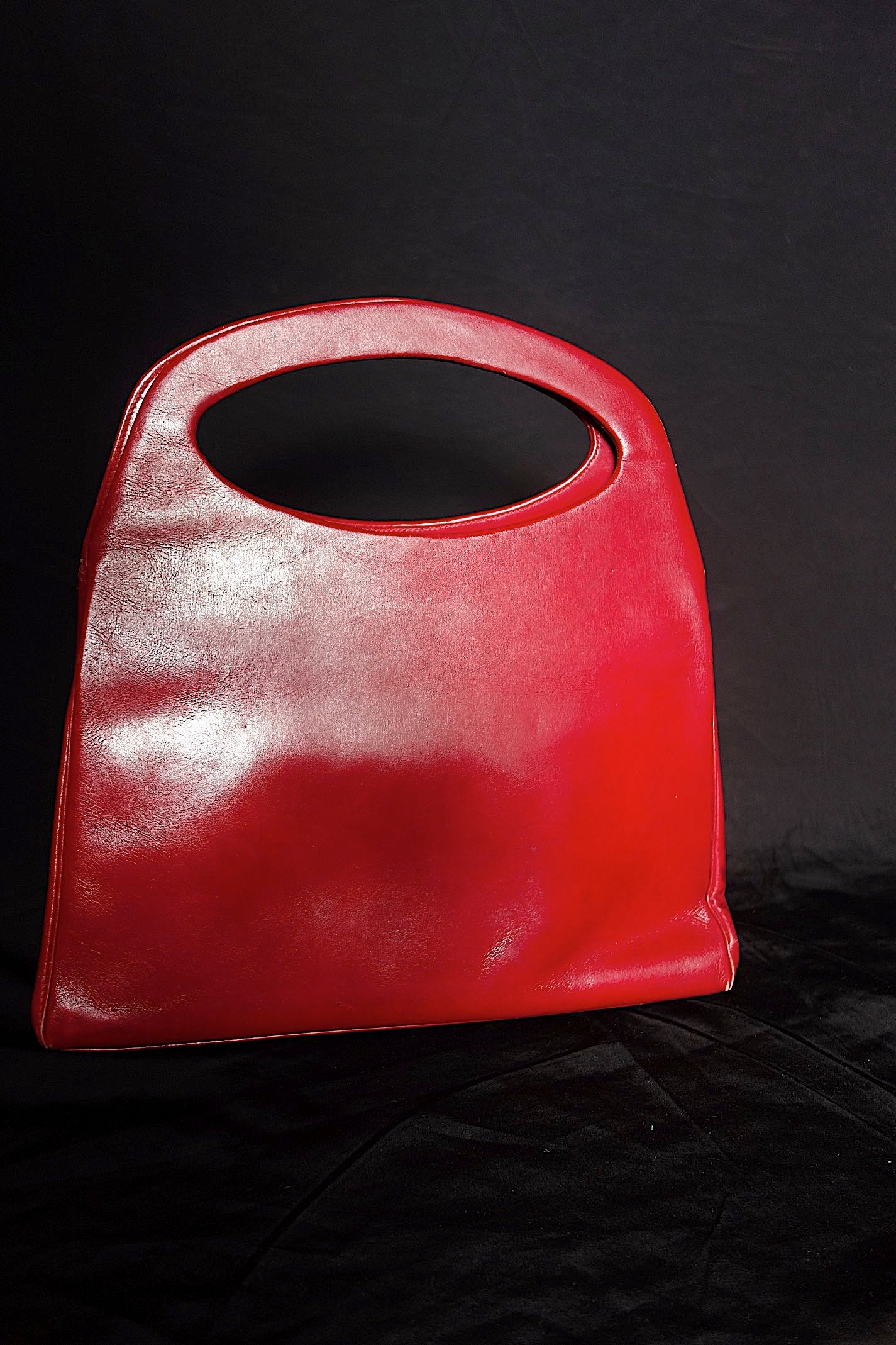 鮮やかな赤のポイントに持つのにぴったりなバッグ。箱型というか、本体とハンドのに継ぎ目のないどこか惹かれるデザイン。がま口はバケリットで両サイドもポケットがあり、とても使いやすいです。
