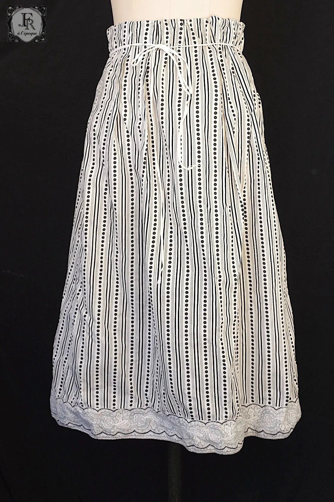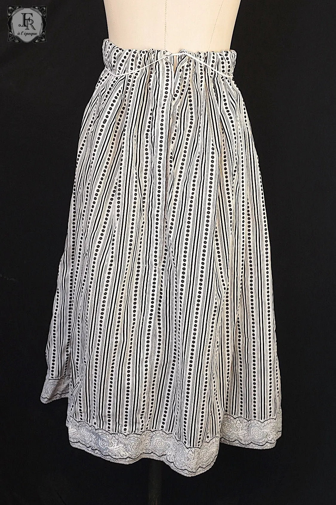 ポワンの柄のスカートです。裾には花柄の生地の装飾ラインです。ウエストラインは手縫いで簡単にされており紐で絞る仕様です。柄はとても珍しいです。