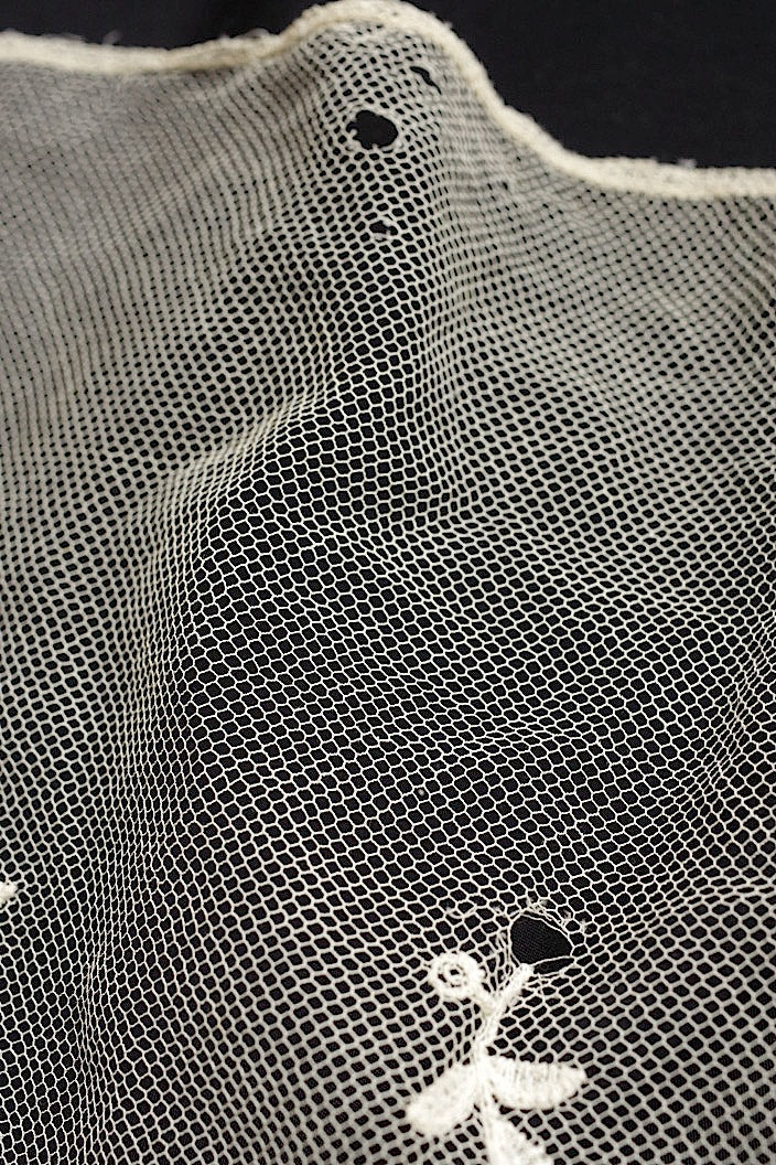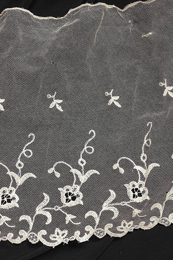 Dentelle brodée grande largeur sur tulle. Il comporte de nombreuses fronces pour le rendre moelleux. Vous pouvez voir quelques petits trous. Il y a une légère tache rouge sur l'œil.